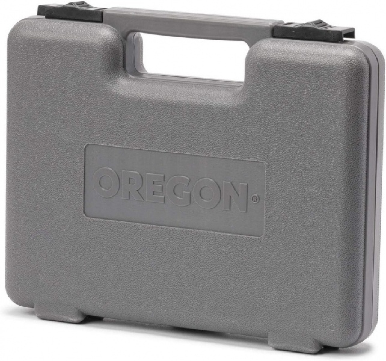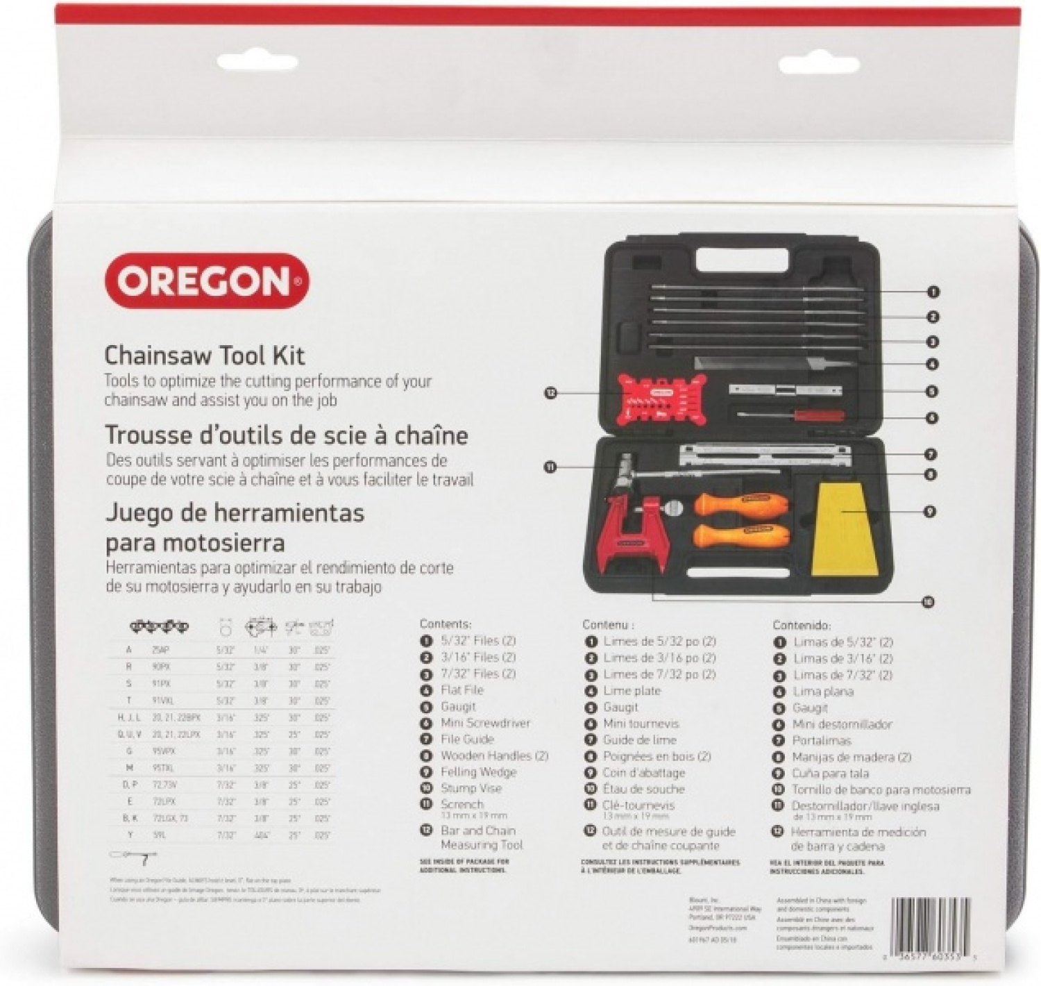 Universāls motorzāģu asināšanas komplekts. Strādājot ar zāģi mežā, celma skrūvspīles notur motorzāģi vietā, izveidojot uz celma darba stendu. Ietver vīles ķēdēm no 1/4" līdz 0,404" solim — ar apaļām vīlēm, plakanu vīli, vīles vadotni, dziļuma mērinstrumentu un vīles rokturiem — lai palīdzētu uzturēt zāģa ķēdi un saglabāt to asu. Motorzāģa uzgriežņu atslēga un mini skrūvgriezis palīdz piekļūt visām zāģa daļām, lai veiktu apkopi. Gāšanas ķīlis palīdz novērst sliedes un ķēdes saspiešanu, veicot zāģēšanu, un nogāzt koku pareizajā virzienā.