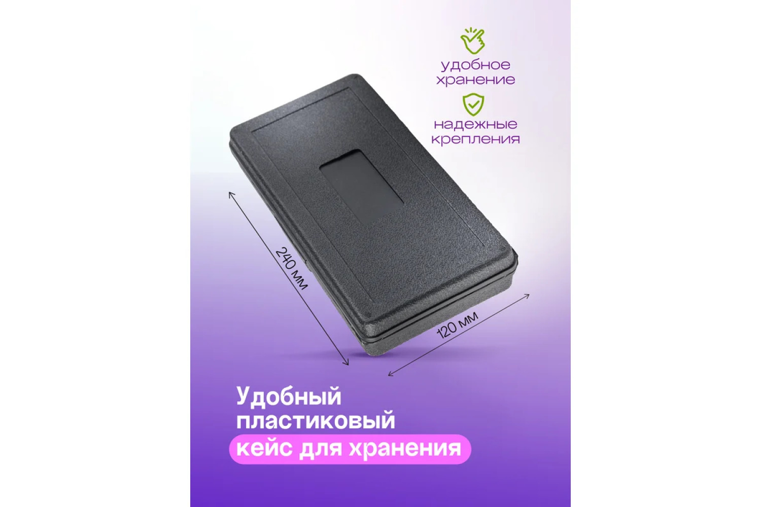 Ērtība uzglabāšanā. Lai nodrošinātu ērtu uzglabāšanu un transportēšanu, komplekts tiek piegādāts izturīgā plastmasas kastē.