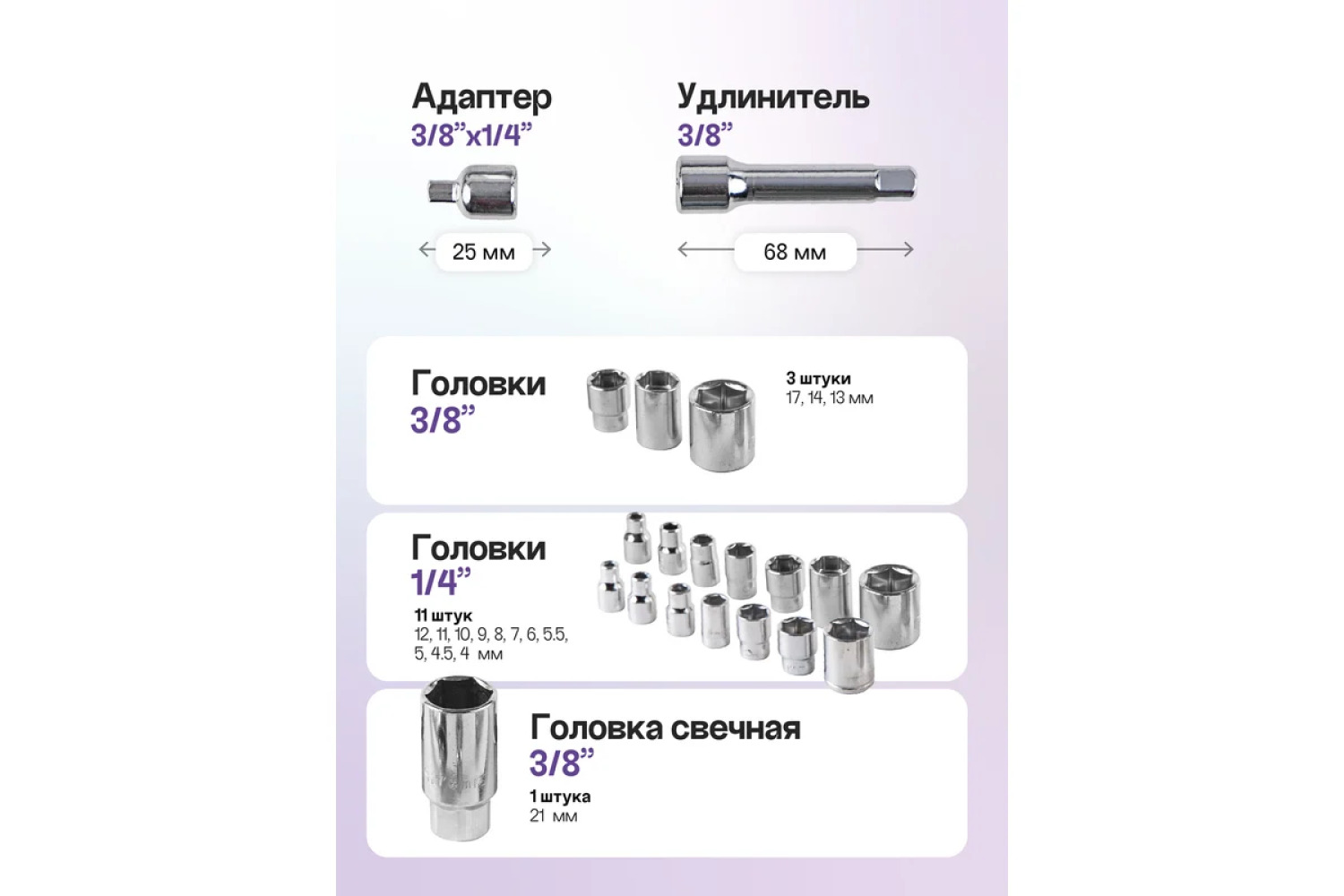 Universālums. Komplekts piedāvā plašu instrumentu un uzgaļu klāstu ar 1/4" un 3/8" (viena ceturtā un trīs astotās collas) kvadrātveida un cauruma savienojumiem, padarot to saderīgu ar lielāko daļu standarta mehānismiem un iekārtām.