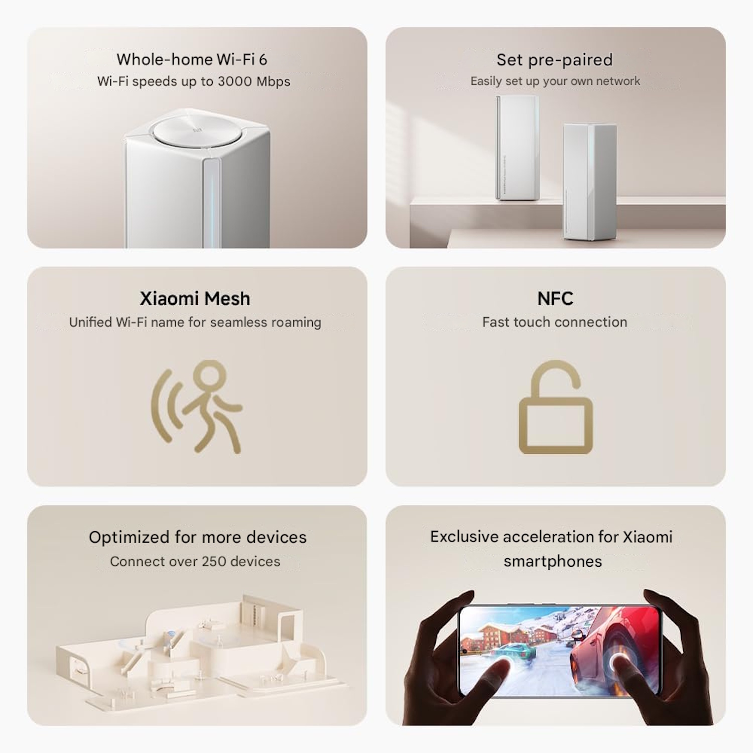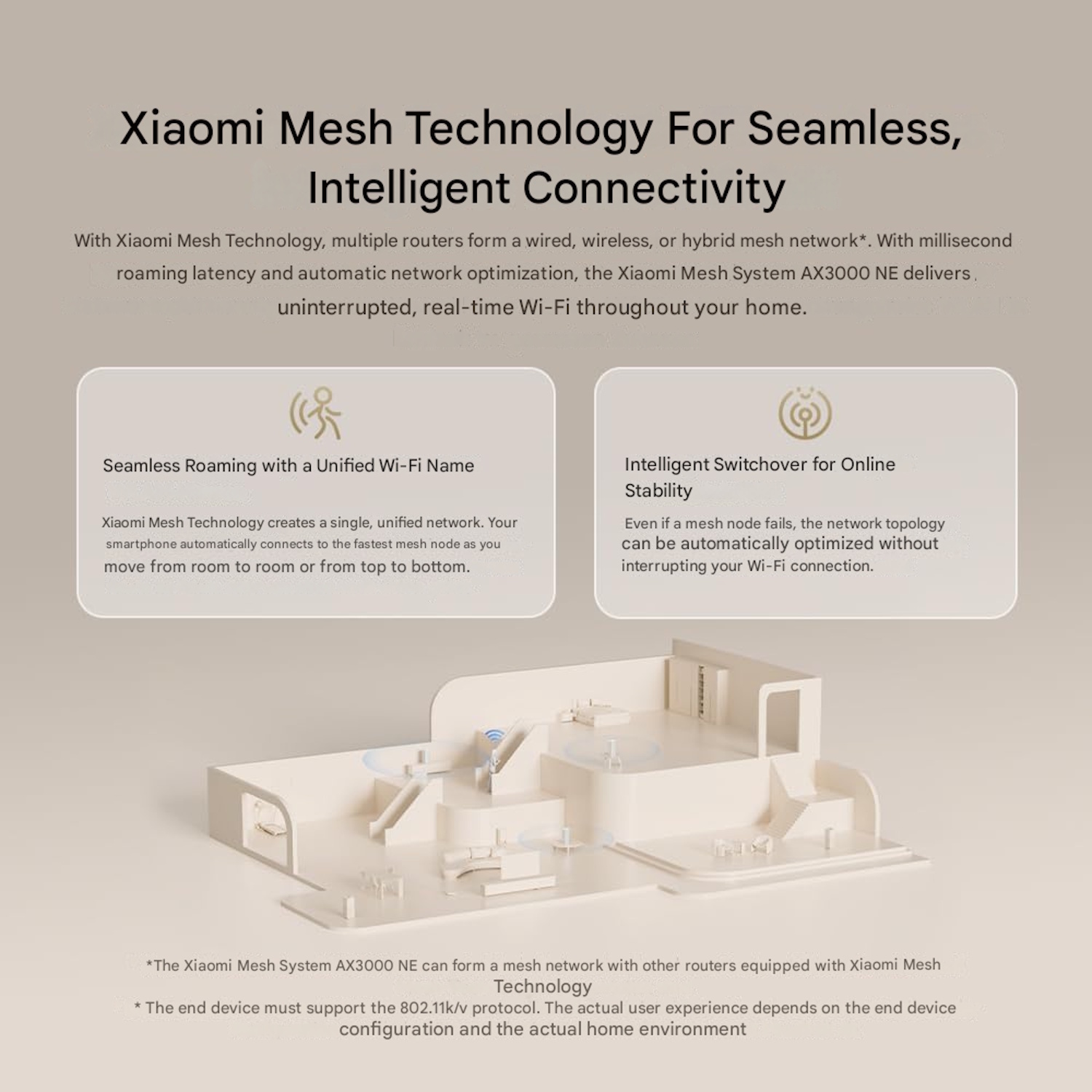 Xiaomi Mesh System AX3000 NE (3-pack) ir jaudīga Wi-Fi 6 mesh sistēma, kas ar AX3000 ātrdarbību un stabilu dual-band 574 + 2402 Mbit/s bezvadu savienojumu nodrošina izcilu pārklājumu visā mājā vai birojā. Trīs vienības veido vienotu, ātru un uzticamu tīklu, kas viegli apkalpo desmitiem ierīču vienlaikus.