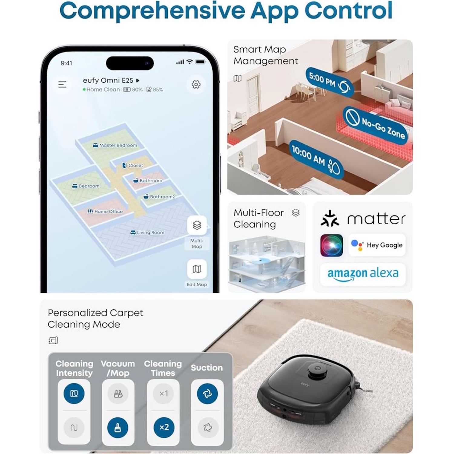 Eufy Omni E25 ir orientēts uz lietotājiem, kuri vēlas maksimālu sūkšanas jaudu bez liekām sarežģītām funkcijām. Atšķirībā no E28 modeļa, E25 koncentrējas uz klasisko, bet ļoti jaudīgo robotu uzkopšanu ar pilnu Omni automatizāciju, saglabājot zemāku sarežģītības līmeni un augstu uzticamību.