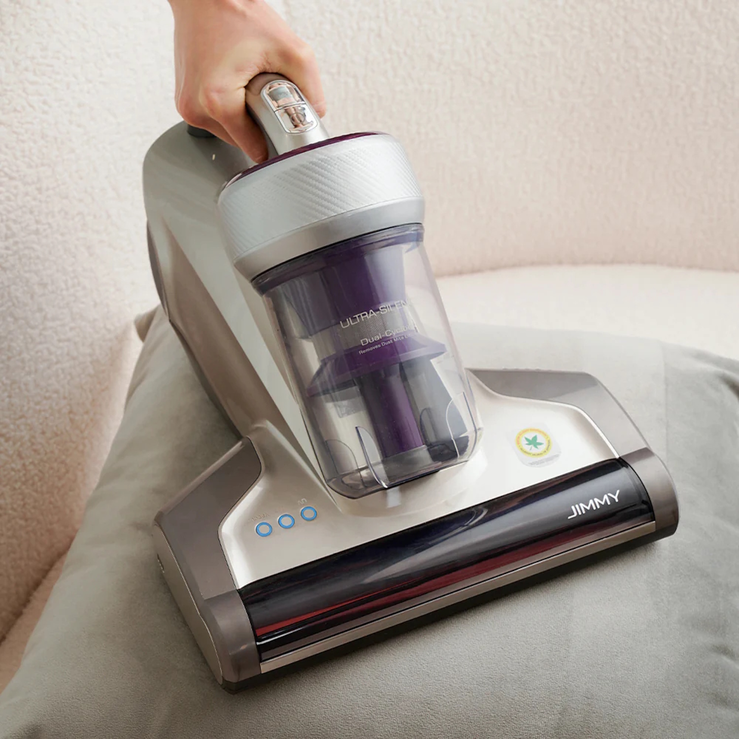 Jimmy JV35 UV ir vadu darbināms rokas putekļu sūcējs, izstrādāts intensīvai audu virsmu uzkopšanai un alergēnu noņemšanai no matračiem, spilveniem, dīvāniem un citām mīkstām virsmām. Aprīkots ar UV lampu, karstā gaisa tehnoloģiju līdz 60 °C un dual-cyclonic filtrāciju, tas apvieno sūkšanu, sitienu un sterilizāciju vienā ierīcē.