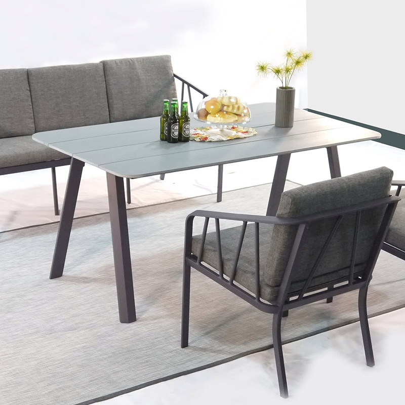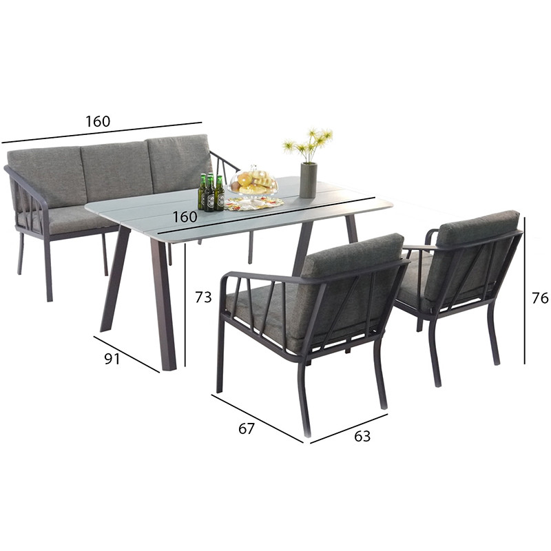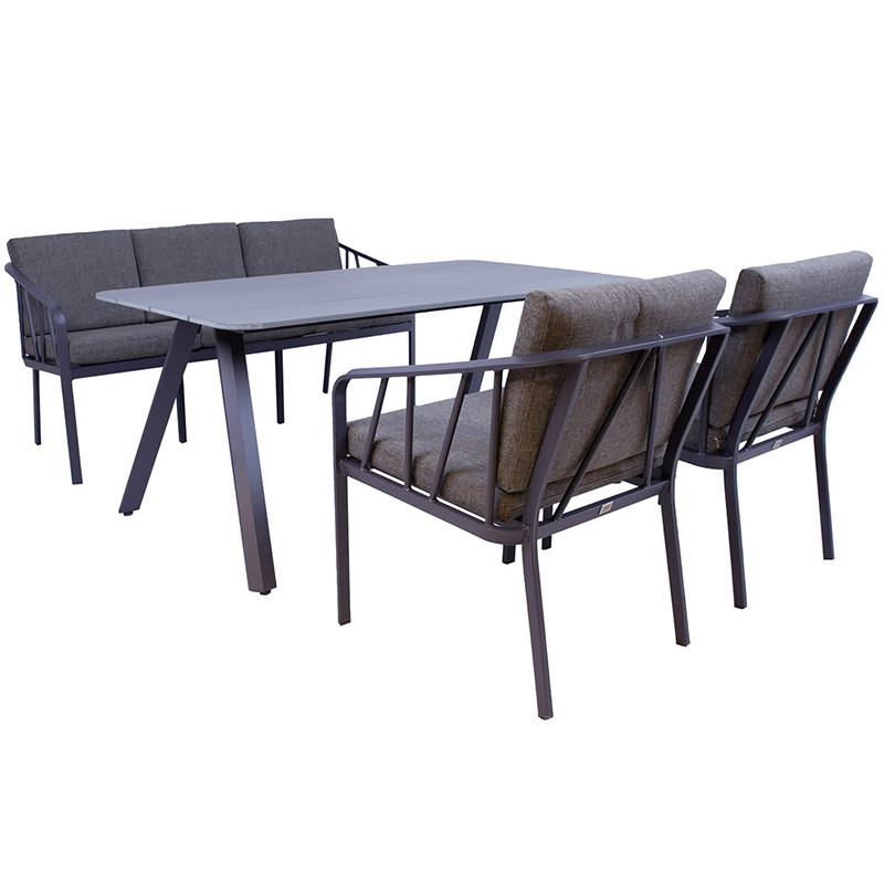 Stilīgs Kahla dārza komplekts ar dīvānu, diviem atzveltnes krēsliem un galdu. Ar šo komplektu jūs varat baudīt vasaras dienas! Dīvāna un krēslu rāmji, kājas un galda rāmis ir izgatavoti no alumīnija un ar pulvera pārklājumu violeti pelēkā krāsā.