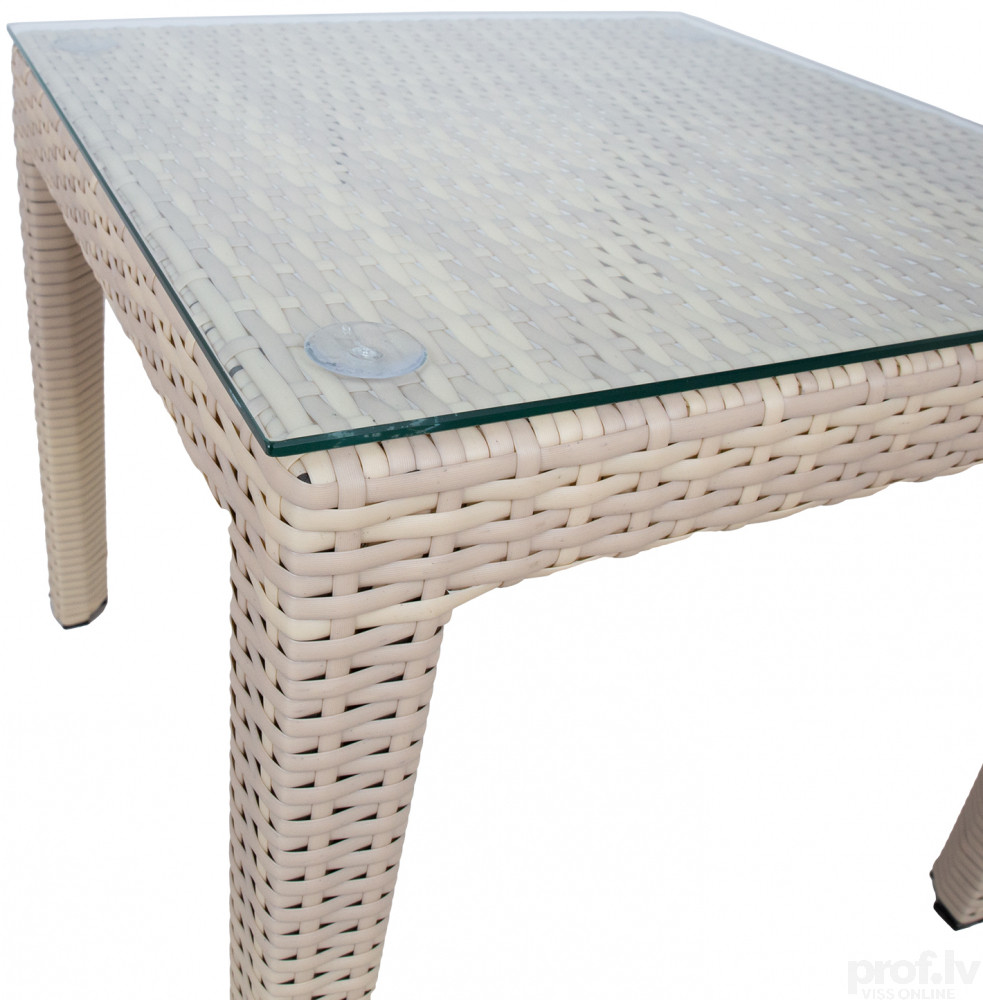 Galdiņa WICKER alumīnija rāmis ir pārklāts ar plastmasas pinumu. Galda virsma: 5 mm rūdīts caurspīdīgs stikls. Produkts ir izturīgs mainīgos laika apstākļos un ļoti viegli kopjams. Vasaras sezonas beigās ieteicams dārza mēbeles uzglabāt telpās.