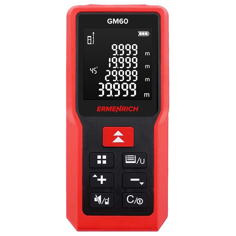 Ermenrich Reel GM60 ir lietotājam draudzīgs, pateicoties tā kompaktajam dizainam un lielajam 4 rindu displejam. Ir pieejami gan viena attāluma mērīšanas, gan nepārtrauktas mērīšanas režīmi, kā arī dažas vairākas mērvienības. Profesionāļi novērtēs tā klusuma režīmu – jūs varat strādāt klusumā, izslēdzot skaņas signālus. Ierīci darbina 2 standarta AAA baterijas, ar vienu bateriju komplektu pietiek vairāk nekā 5000 mērījumiem. Lai taupītu enerģiju, ir lāzera un pašas ierīces automātiskās izslēgšanas funkcija. Ierīces vēstures ierakstā var saglabāt lielu datu apjomu – 100 grupas.