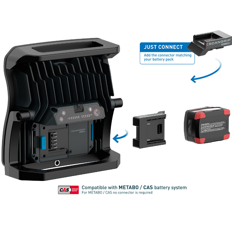 Ainulaadse omadusena ühildub NOVA 10 CONNECT SCANGRIP CONNECTORi kaudu METABO / CAS 18 V akusüsteemiga ja kõigi teiste juhtivate elektritööriistade kaubamärkide 18 V/20 V akudega. Lisaks saab SCANGRIP POWER SUPPLY-d kasutada alalisvooluga, tagades piiramatu valguse kättesaadavuse. NOVA 10 CONNECTil on ka sisemine varuaku, mis annab 1 lisatunni 1000 luumeniga.