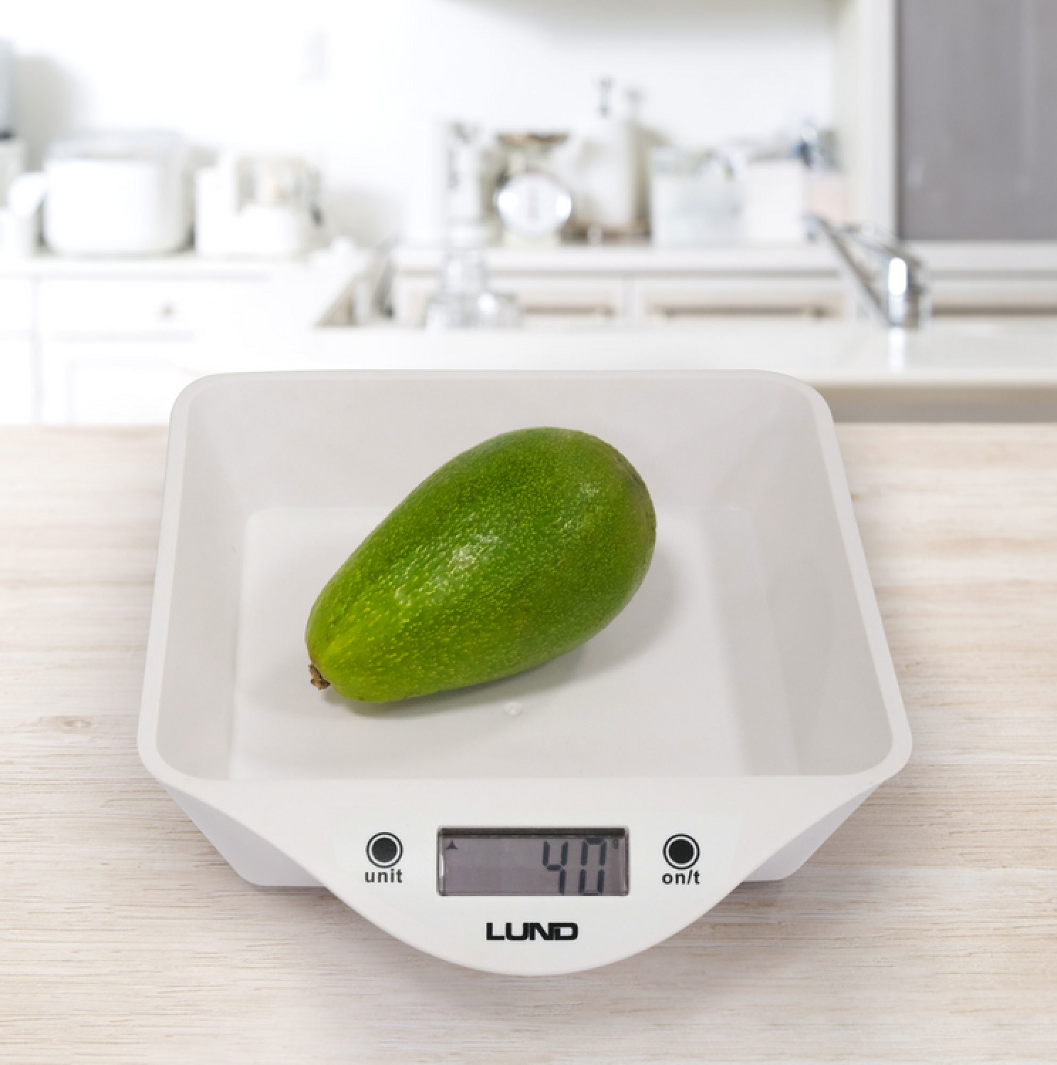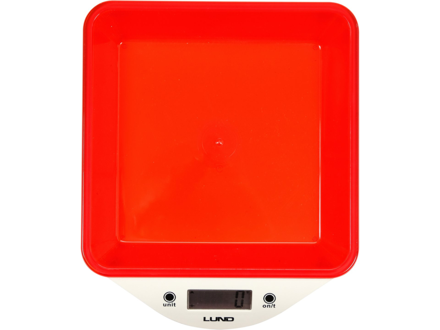 LUND köögikaal kausiga, mille kogumaht on 800 ml ja maksimaalne koormus 5000 g. Seade on varustatud kergesti loetava LCD-ekraaniga, kus kuvatakse 4 kaaluühikut, lisaks on olemas ülekoormuse ja madala aku taseme indikaatorid. Tootel on lisainfoainena eemaldatav kauss, mida saab pesta nõudepesumasinas.