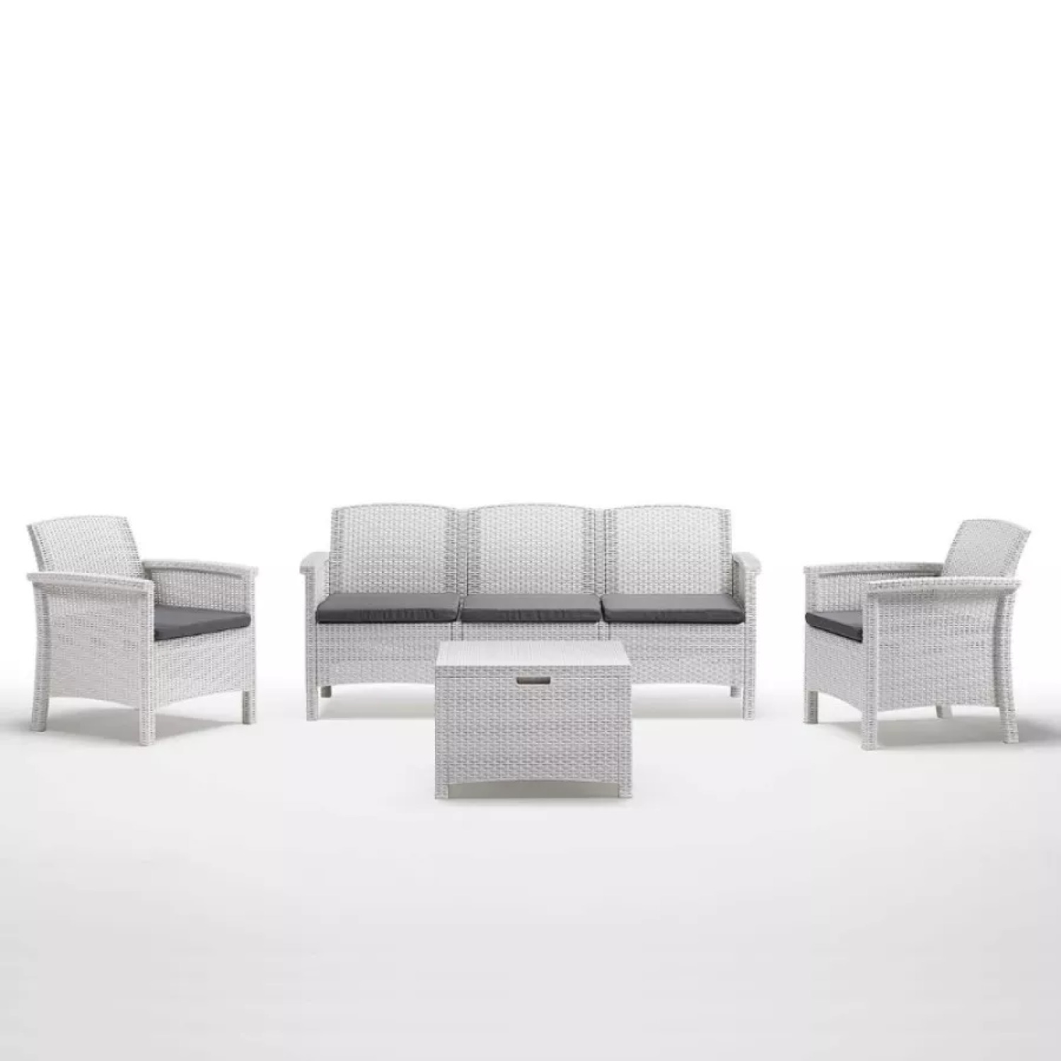Kolmekohaline diivanikomplekt Venezia on eriti elegantne, mugav ja vastupidav aiamööblikomplekt, mis tagab mugava, rahuliku ja lõõgastava viibimise roattanist punutud mustriga. Venezia 3 aiamööblikomplekt on valmistatud kvaliteetsest taaskasutatavast polüpropüleenist ja klaaskiust kombinatsioonist, kasutades survevalu tehnoloogiat, mis annab sellele suure vastupidavuse igapäevases kasutuses ja vastupidavuse ebasoodsatele ilmastikutingimustele. Ideaalne salongikomplekt igasse sisustuskonteksti: privaatselt - siseruumides, rõdul, terrassil või aias, aga ka professionaalses kontekstis, näiteks baarides, kohvikutes ja paljudes muudes kohtades. Aiamööblikomplekt Venezia 3 ei taga mitte ainult suurepärast vastupidavust, vaid pakub külalistele ka suurt mugavust tänu suurtele istepindadele ja kaldega ergonoomilisele seljatoele. Oluline lisaväärtus on see, et seda saab kokku panna ilma metallosadeta, nagu kruvid või poldid, mis võivad aja jooksul ja vabas õhus niiskuse või halbade ilmastikutingimustega kokku puutudes roostetada. Valmistatud spetsiaalse tehnoloogiaga - kokkupanekuks ei ole vaja tööriistu. Praktiline ja täpne süsteem, mis tagab suure kokkupaneku lihtsuse.