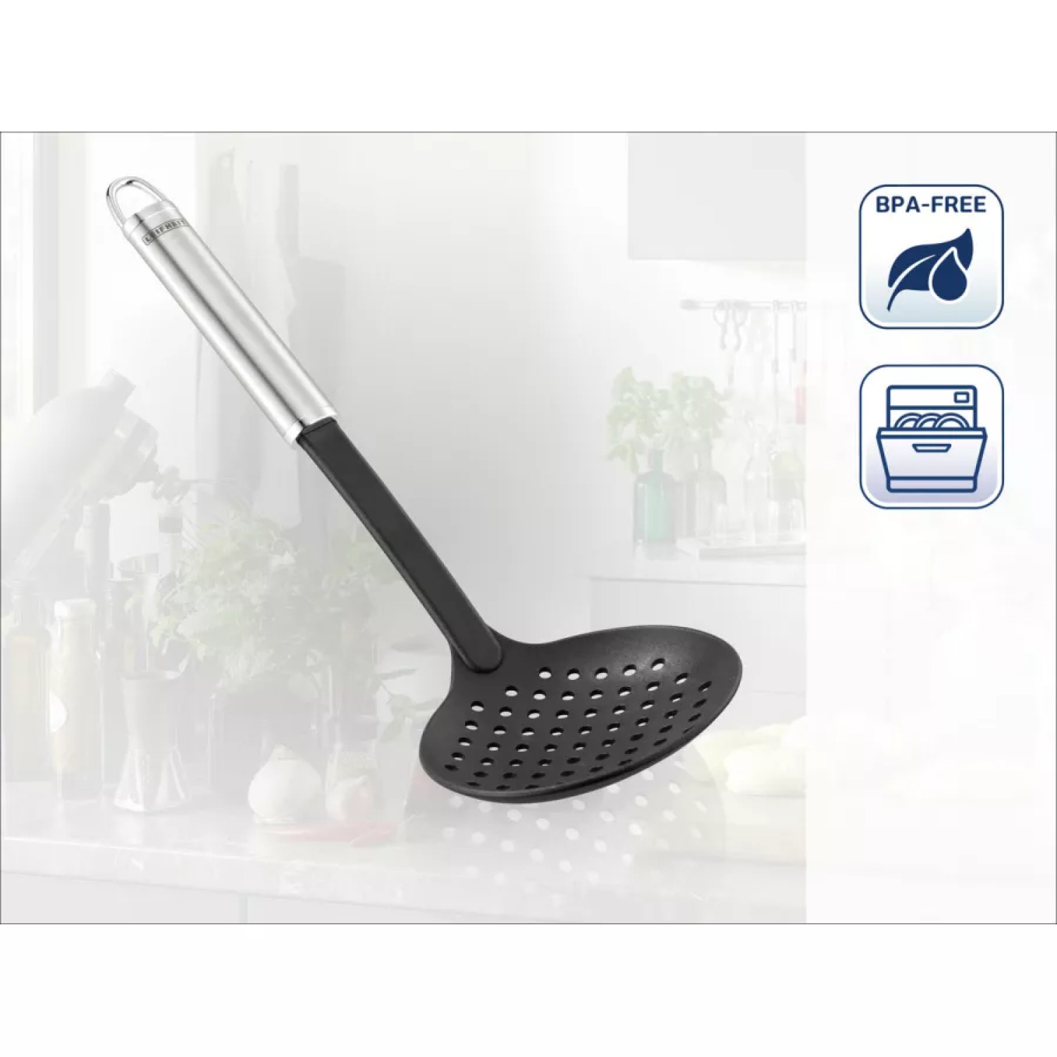 Roostevaba teras tagab meeldiva stabiilsuse ning tarvikutel on integreeritud riputussilmus, mis sobib suurepäraselt Leifheit köögitarvikute hoidiku juurde.