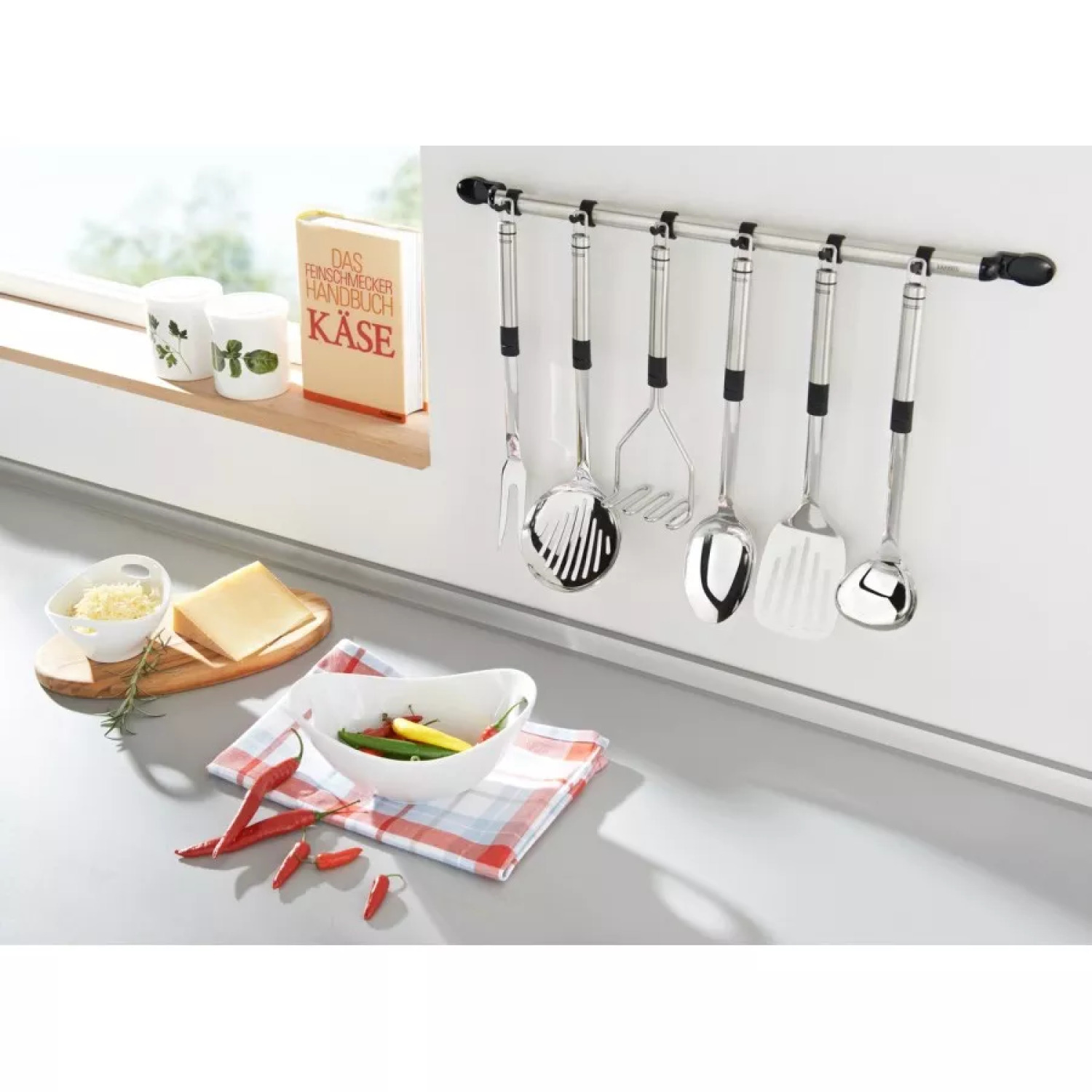 LEIFHEIT Virtuves piederumu turētājs ProLine on praktiline ja elegantne lahendus, et hoida kõiki köögitarvikud korralikult ja mugavalt. Selle raam, mille pikkus on 55 cm, sisaldab koos 9 liigutatavat konksu, mis võimaldab paindlikku ja mugavat organiseerimist.