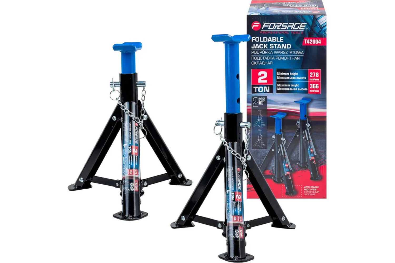 Forsage F-T42004 toetusalused on usaldusväärne varustus, mille tõstevõime on kuni 2 tonni. Need on ideaalne lahendus autode töötubades, garaažides või igas kohas, kus on vajalik turvalisus, toetus ja kaitse raskete autode või muude esemete ümberpööramise eest.