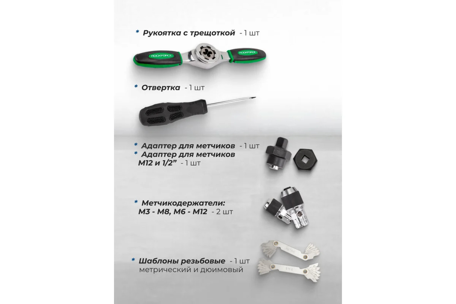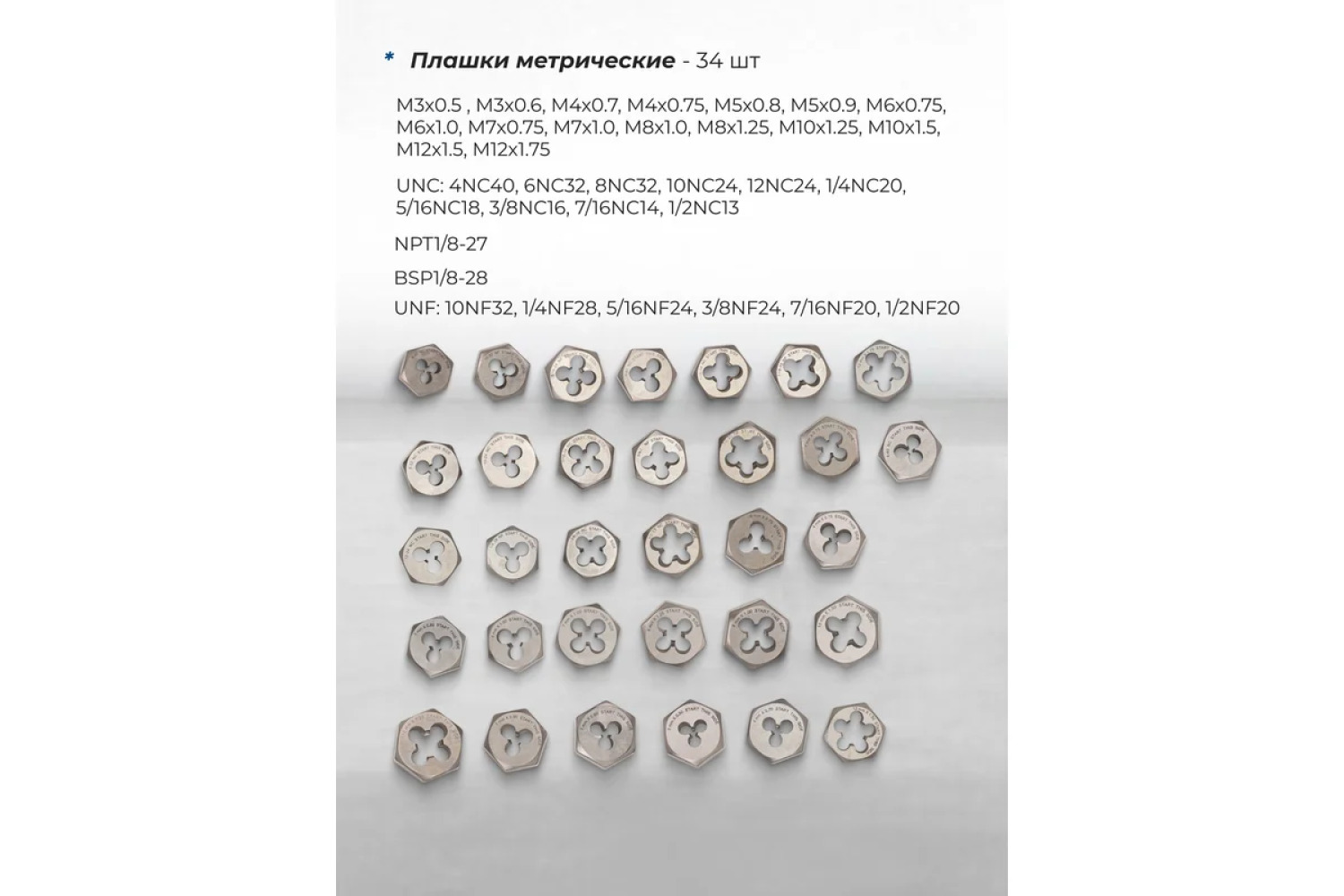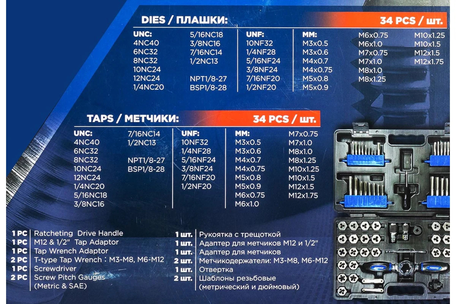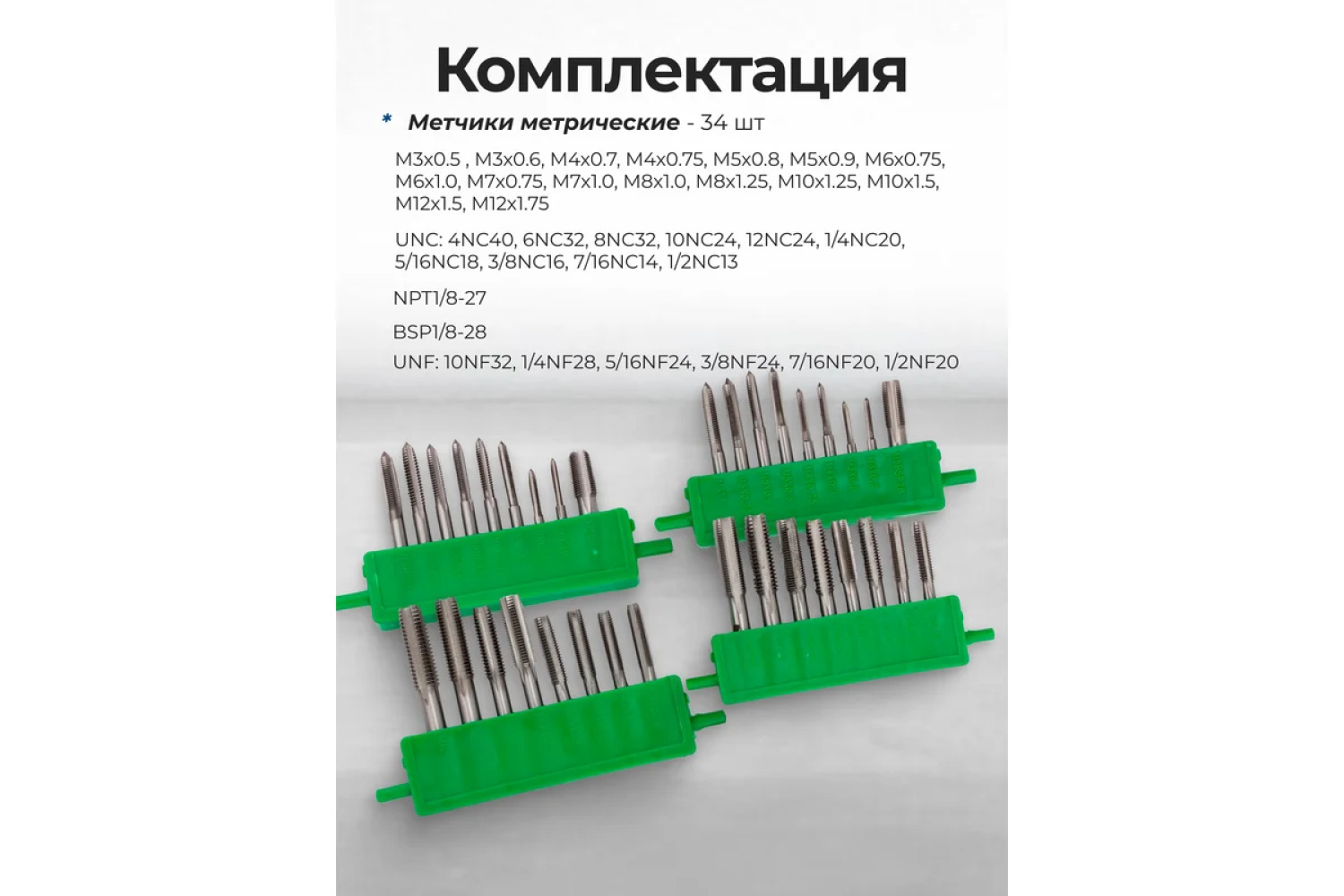 Komplekt sisaldab 34 keermetappi ja 34 keermestajat erinevates suurustes (NC, NF, BSP, NPT, M), peaga tööriista, adaptereid, kahte keermestajate hoidjat, kruvikeerajat ja kahte keermemõõtmisvahendit (meetrites ja tollides). Kõik tööriistad on mugavalt asetatud vastupidavasse kasti, mis muudab nende ladustamise ja kaasavõtmise lihtsaks.