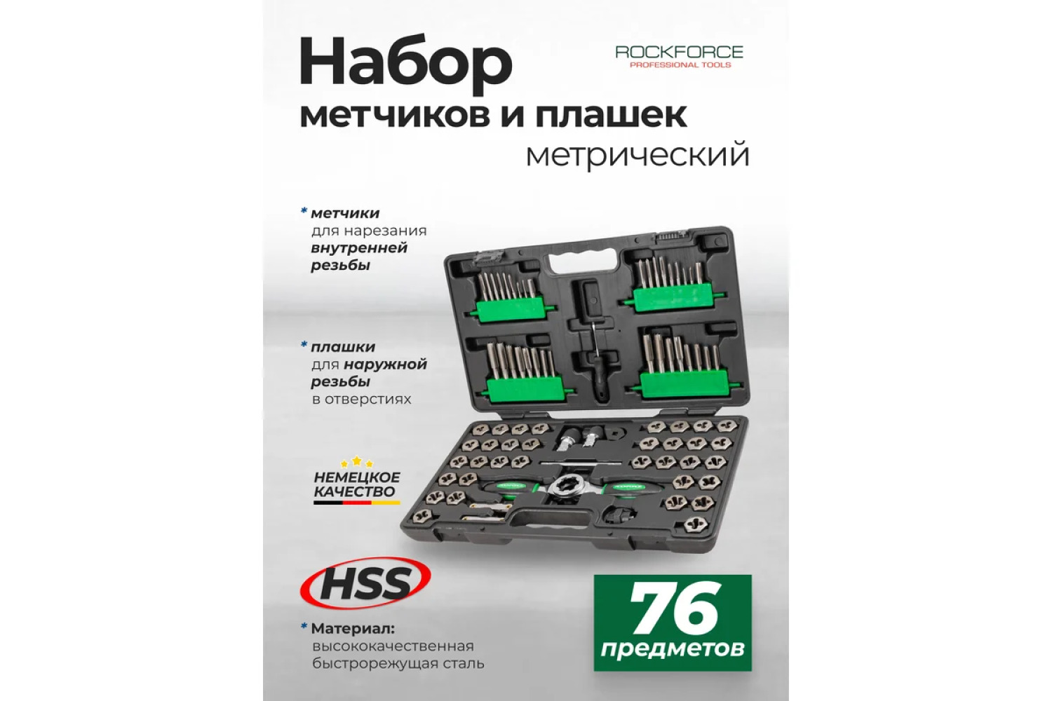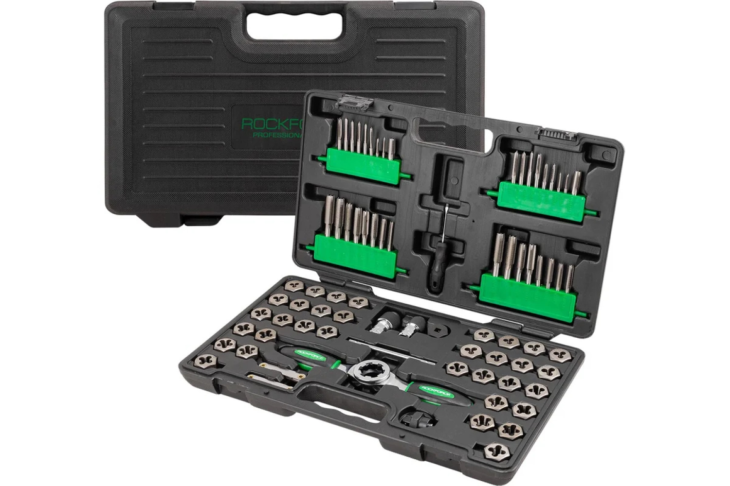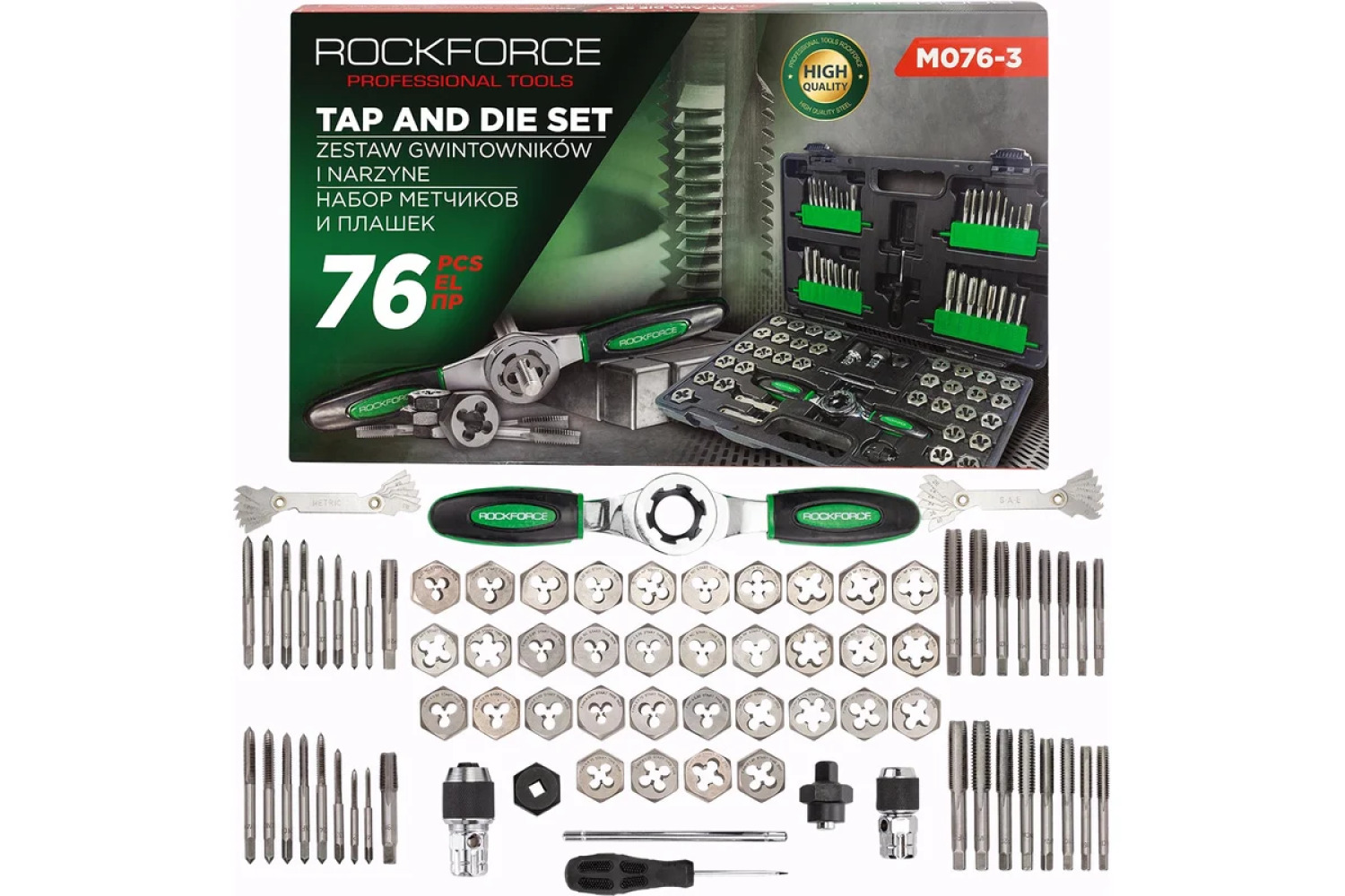 ROCKFORCE keermestajate ja keermetappide komplekt RF-M076-3 on universaalne 76 professionaalse tööriista komplekt, mis on loodud täpsete ja usaldusväärsete sisemise ja välise keermetöötluse jaoks. Sobib ideaalselt nii töökojakasutuseks kui ka koduseks kasutamiseks, katab kõik populaarsed keermetüübid — alates meetrilistest kuni tollide ja toru keermeteni.