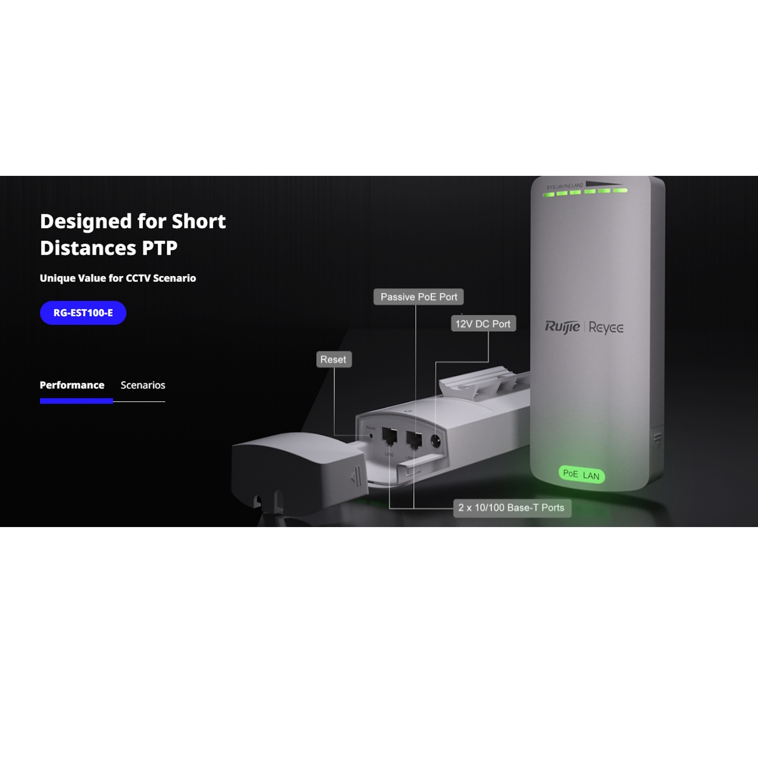 Ruijie RG-EST100-E on kompaktne, suure kasumiga 2.4GHz traadita sild, mis on mõeldud punkt-punkti edastamiseks kuni 500 meetrit. See sobib ideaalselt välistingimustes kaamera süsteemidele, lao võrgustikele, maapiirkondade rakendustele ja IoT laiendamisele, pakkudes stabiilset pika ulatusega suhtlust seal, kus kaablite paigaldamine on ebaefektiivne või kulukas.