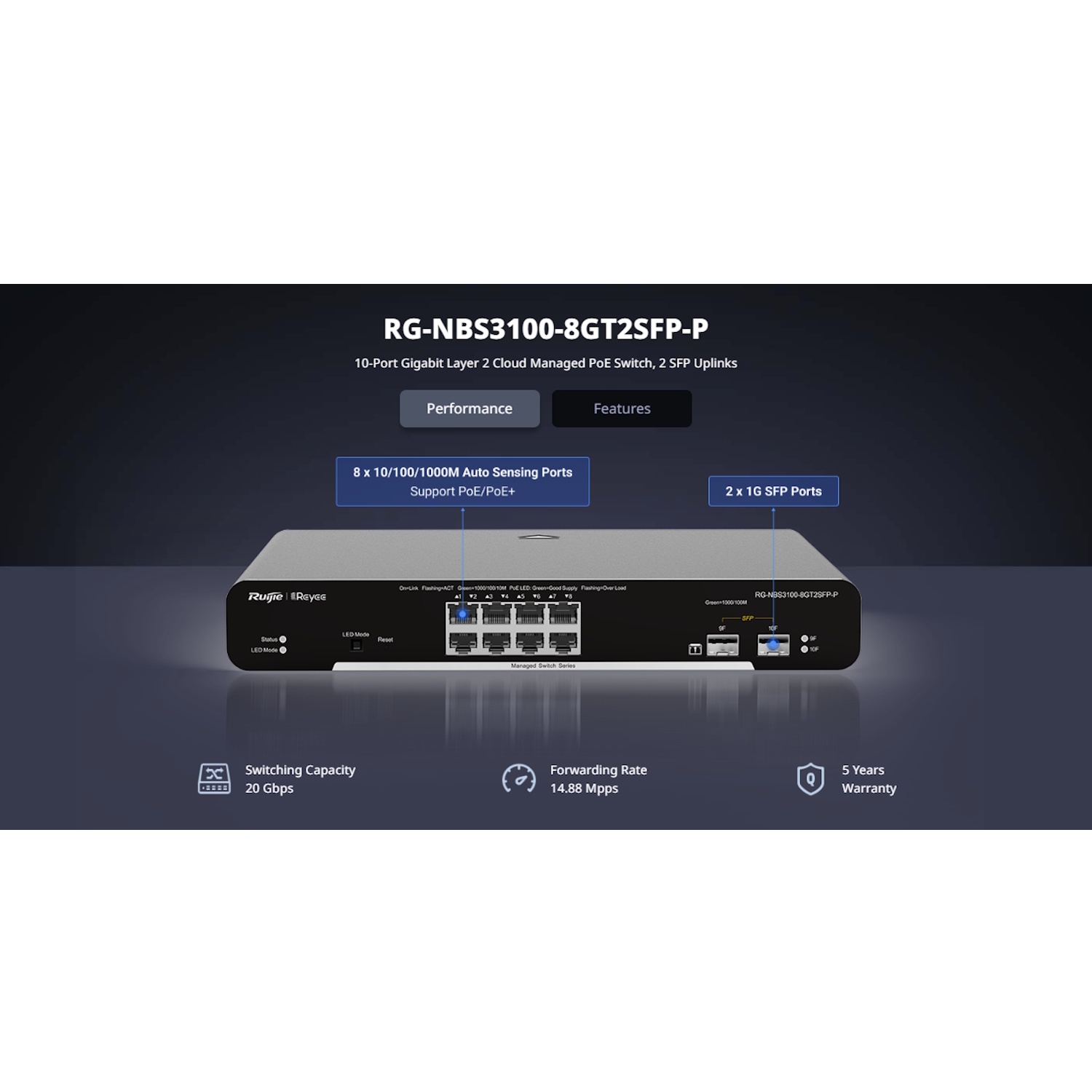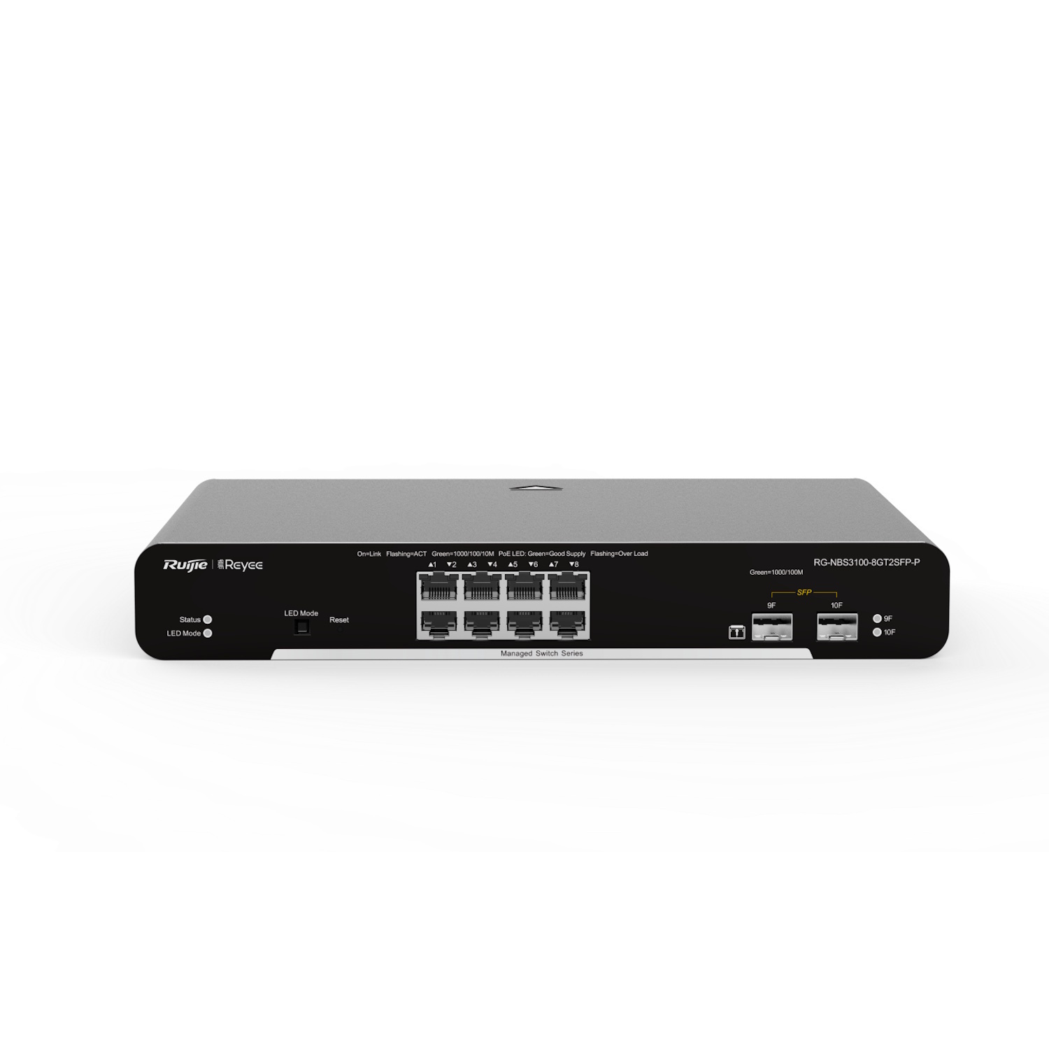 Ruijie RG-NBS3100-8GT2SFP-P on kõrge jõudlusega Layer 2 hallatav PoE+ lüliti koos pilvepõhise juhtimise, 8× PoE+ gigabit portide ja 2× SFP üleskande portidega. Ideal äri-kriitiliste lahenduste jaoks, nagu IP jälgimine, traadita juurdepääsu infrastruktuur või VoIP jaotus, see pakub tsentraliseeritud juhtimist, robustseid turvafunktsioone ja pikaajalist stabiilsust.