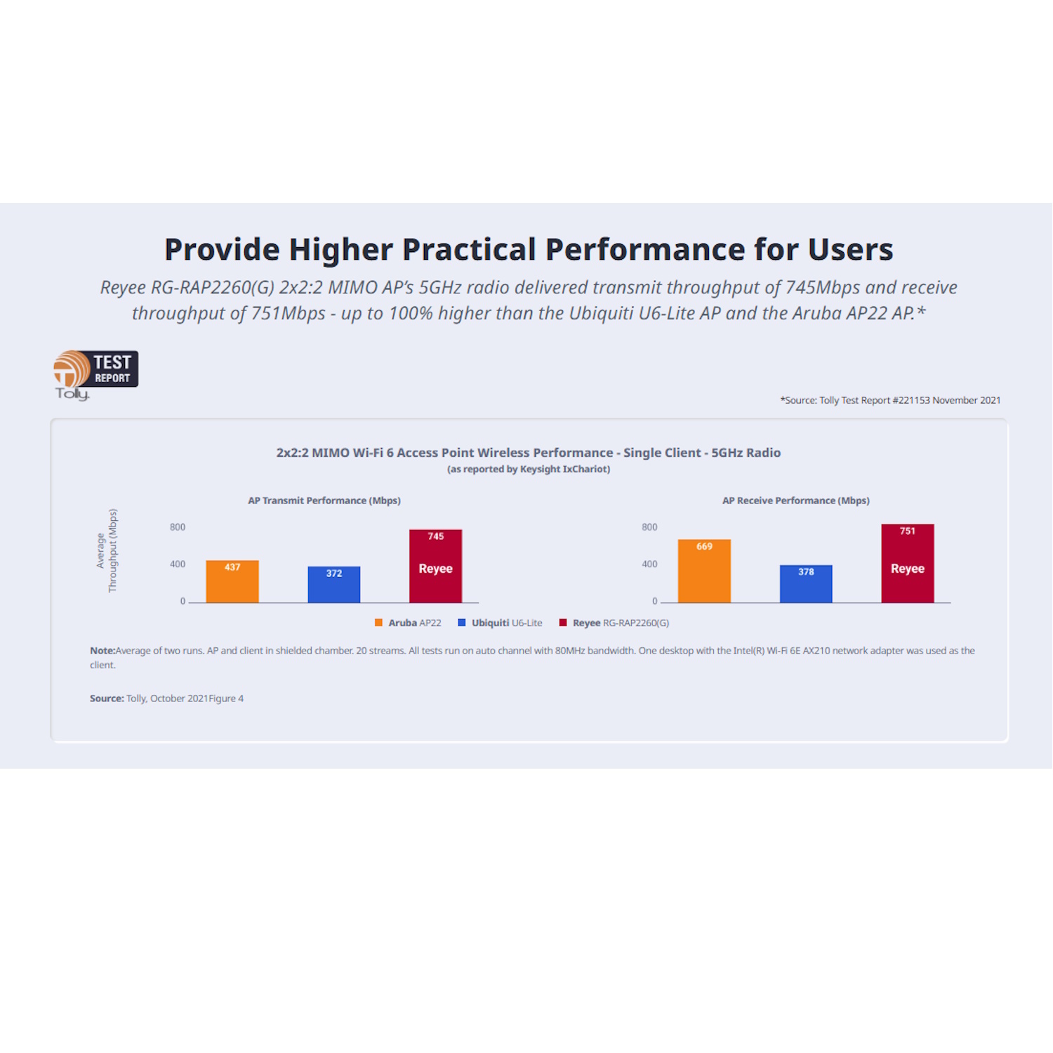 Ruijie RG-RAP2260(G) on kõrge jõudlusega Wi-Fi 6 AX1800 laemontaažiga ligipääsupunkt, mis on loodud kõrge tihedusega ettevõtte keskkondadele, nagu kontorid, hotellid, koolid ja moodsad jaemüügid. Kahe sagedusega AX1800 kiirus, pilvepõhine haldus ja kaks Gigabit Etherneti porti tagavad sujuva töö, lihtsustatud paigaldamise ja kaasaegse juhtmevaba stabiilsuse hõivatud võrkudes.