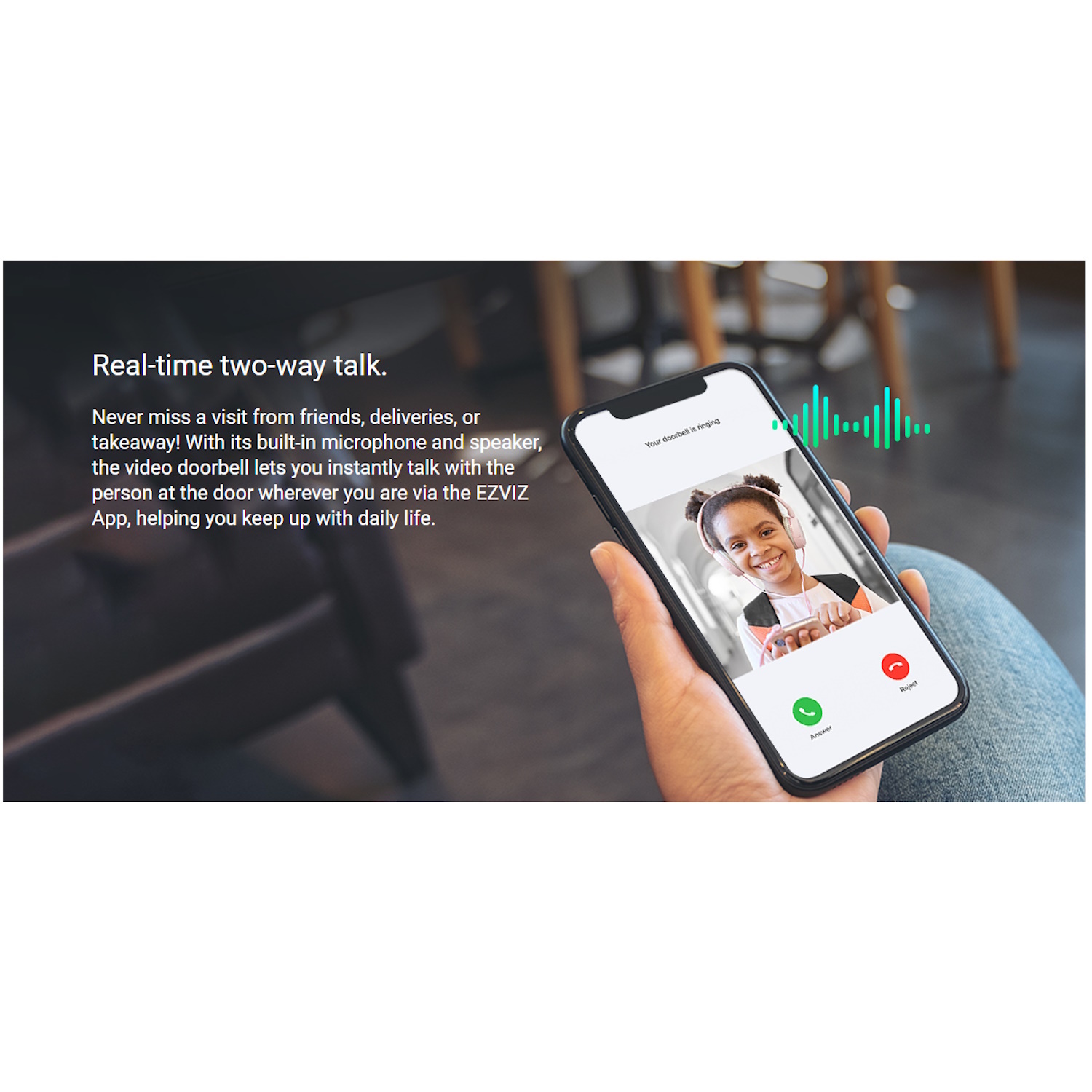 Reaalajas kahepoolne vestlus – Suhtle hetkega külalistega läbi sisseehitatud mikrofoni ja kõlari EZVIZ rakenduse abil, olgu sa kodus või eemal.