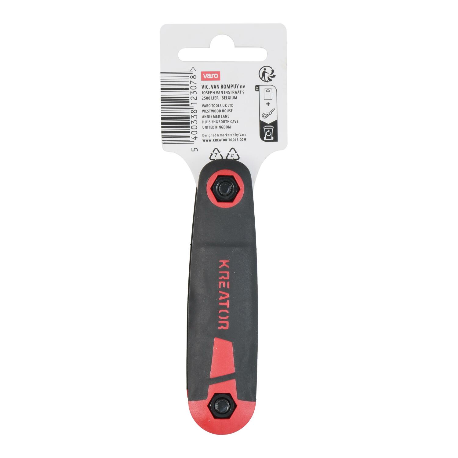 See on praktiline 8-osaline L-kujuliste kuuskantvõtmete komplekt meie KREATOR seeriast. Nagu Šveitsi taskunugaga, saate kuuskantvõtmed kokkuklappida ja tööle asuda. Need on valmistatud kõrgekvaliteedilisest kroomvanaadiumist.