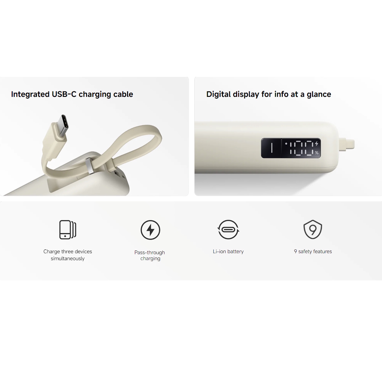 Xiaomi Power Bank (BHR08O0GL) Tan on kompaktne ja võimas 10000 mAh akupank 67 W kiire laadimise ja sisseehitatud USB-C kaabliga. Ideaalne igapäevaseks kasutamiseks, tööks ja reisimiseks.