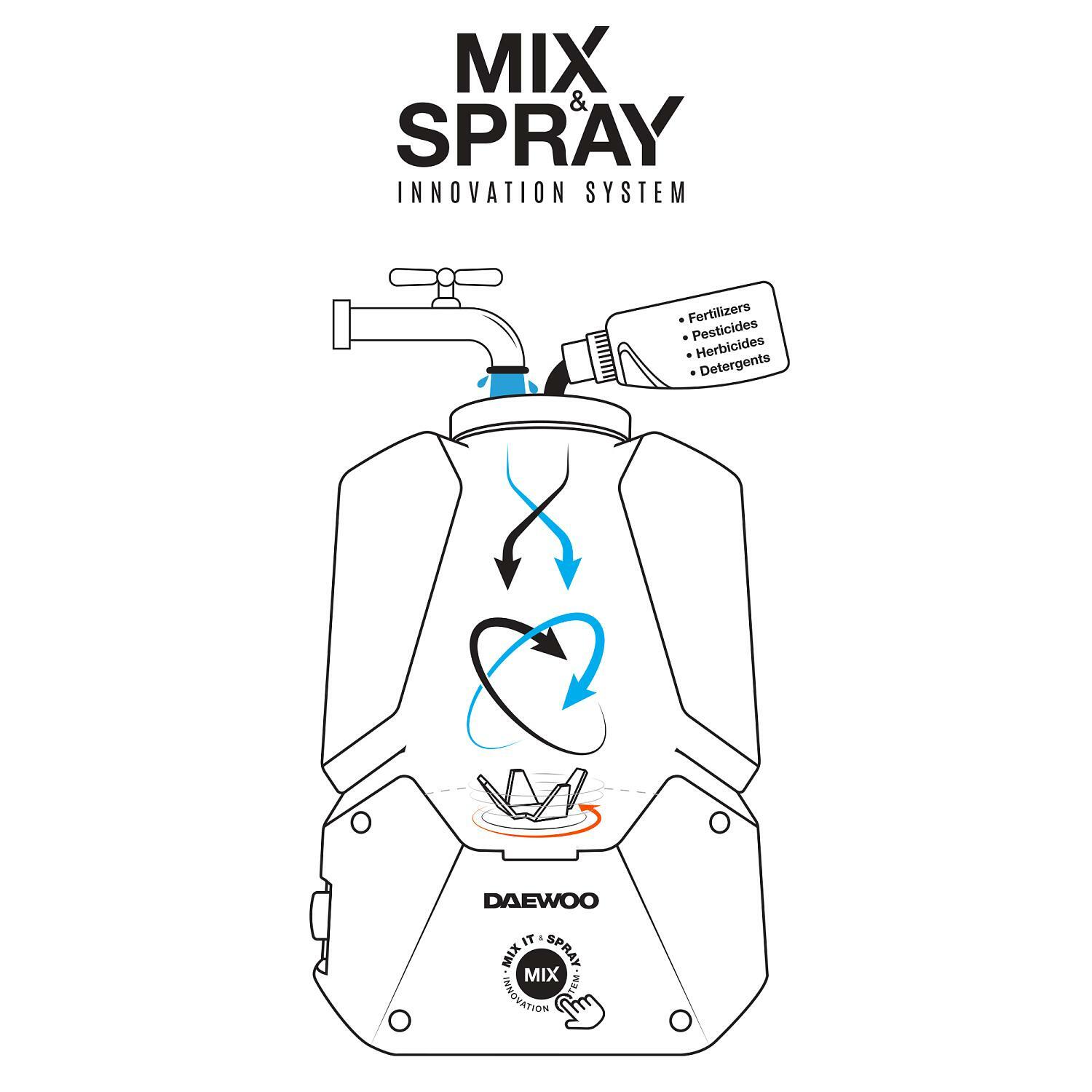 Innovatiivne MIX&SPRAY funktsioon – täiendav pump tekitab voolu, mis segab vett ja kemikaale otse pritsija paakis.