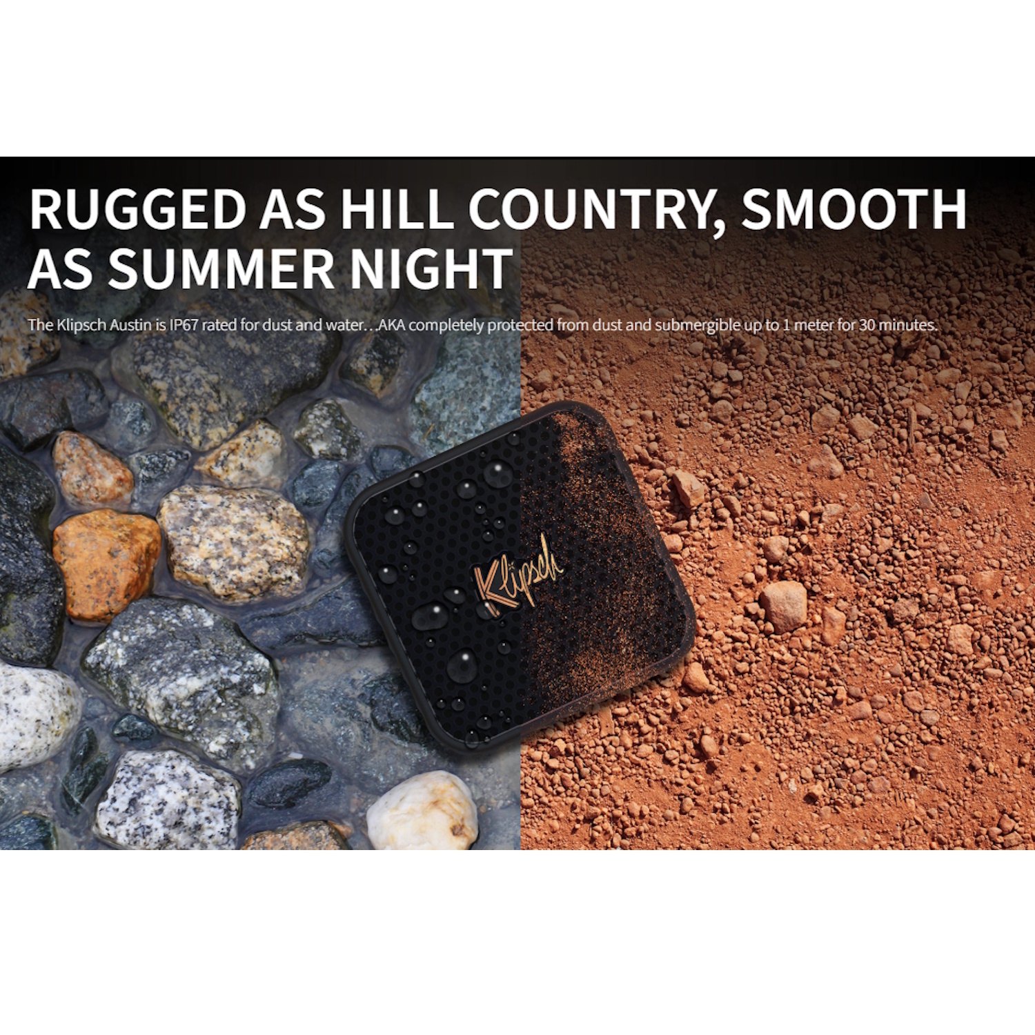 Klipsch Austin on kompaktne kaasaskantav Bluetooth-kõlar 10 W RMS võimsusega, IP67 vee- ja tolmukaitsega ning kaasaegse Bluetooth 5.3 ühendusega. See pakub selget ja dünaamilist heli legendaarses Klipschi akustilises stiilis kuni 12 tundi järjest. Ideaalne kaaslane aktiivseks igapäevaeluks ja seiklusteks looduses.