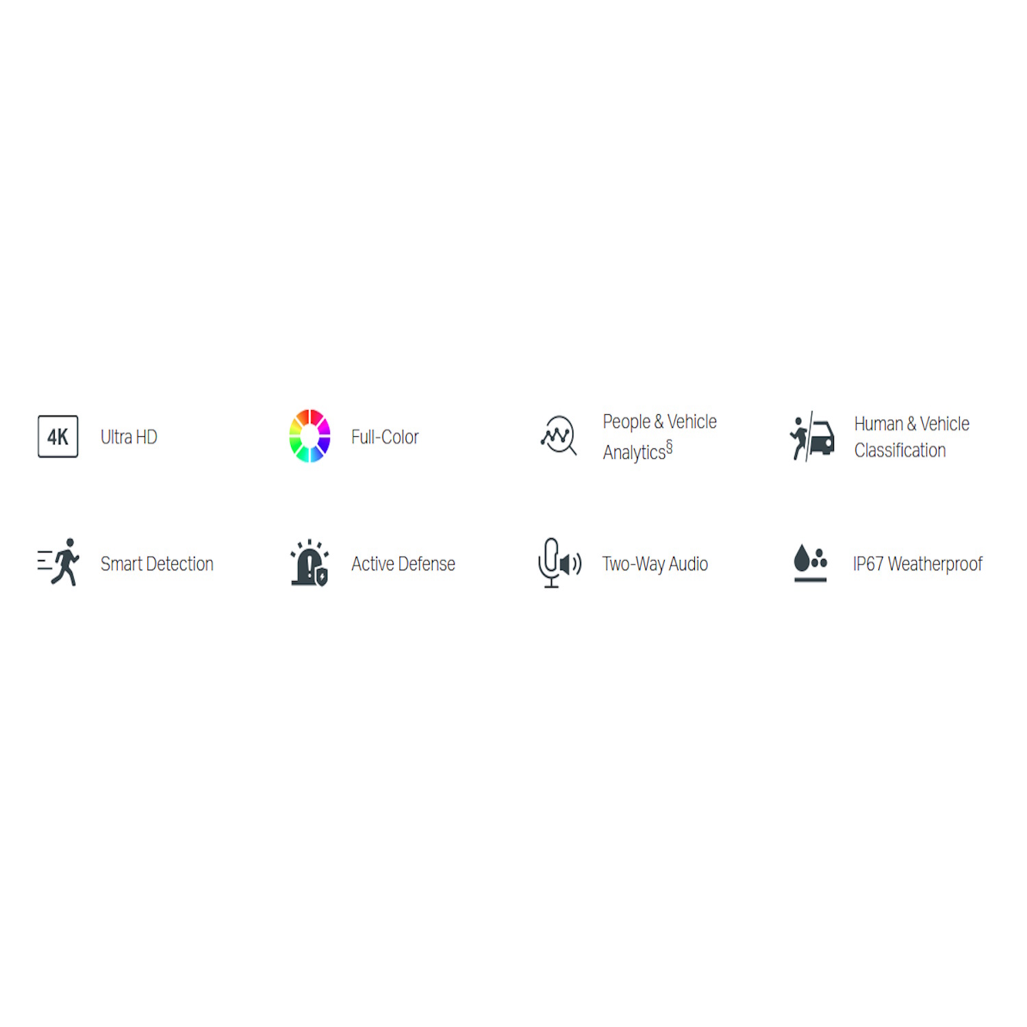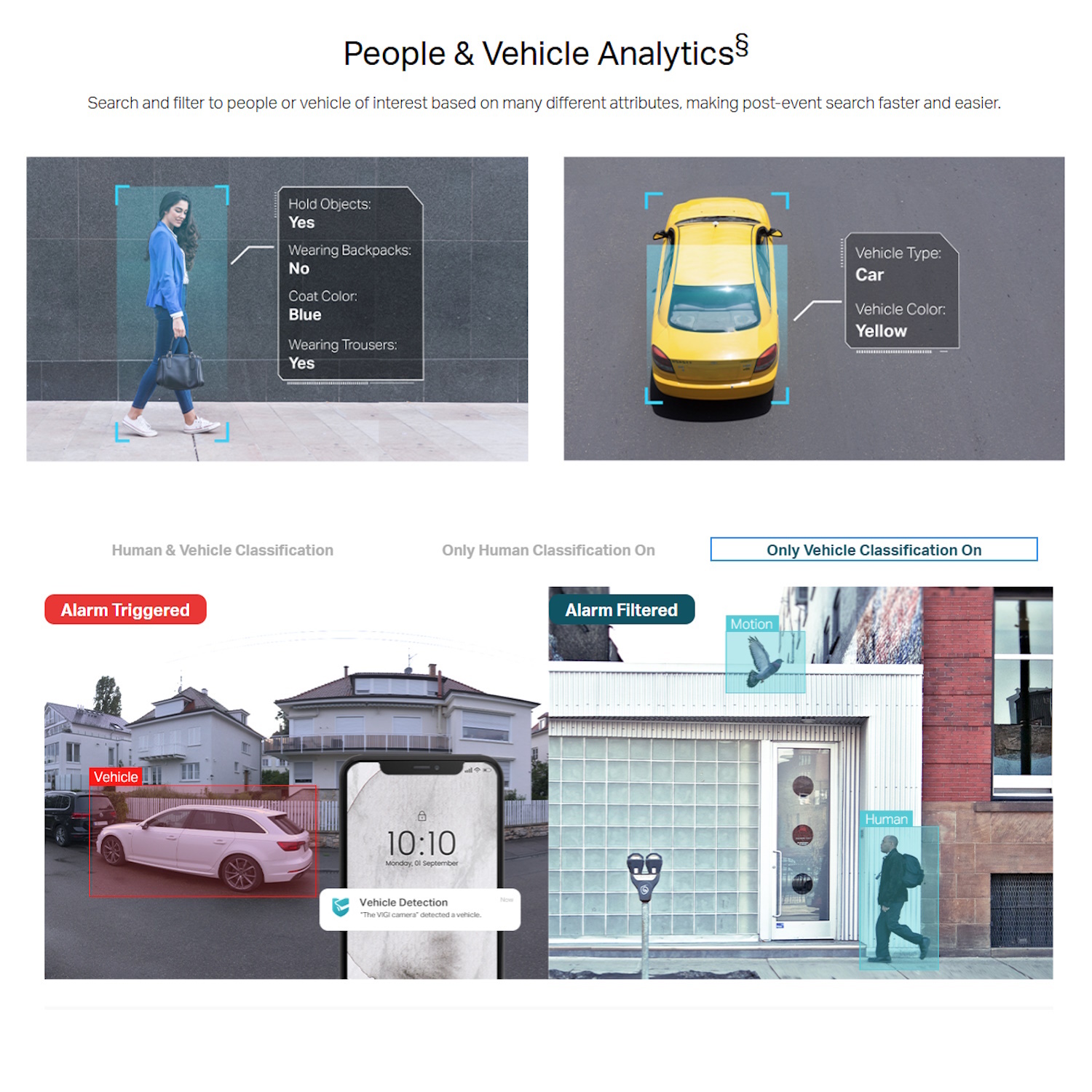 Human & Vehicle Classification → eristab inimesi ja autosid teistest objektidest, täpsemad teavitused.