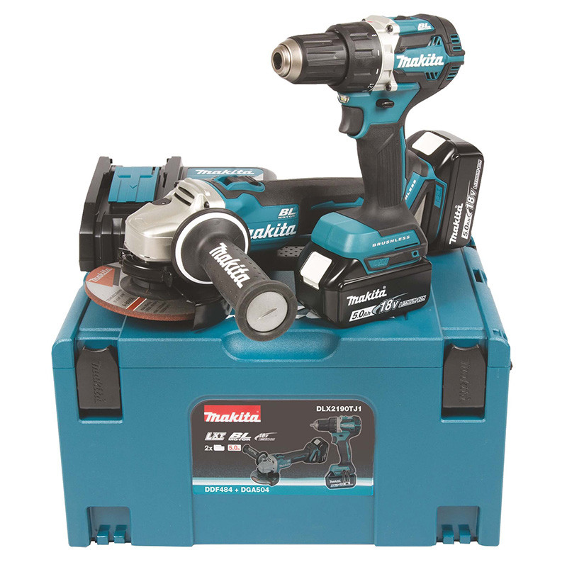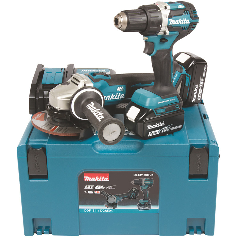 Kvaliteetne komplekt kahest 18V LXT akuharjadeta tööriistast ehitus- ja metallitöötlemiseks. Komplektis on DDF484 trell, DGA504 nurklihvija, kaks 5,0 Ah akut, kiirlaadija ja Makpac ümbris.