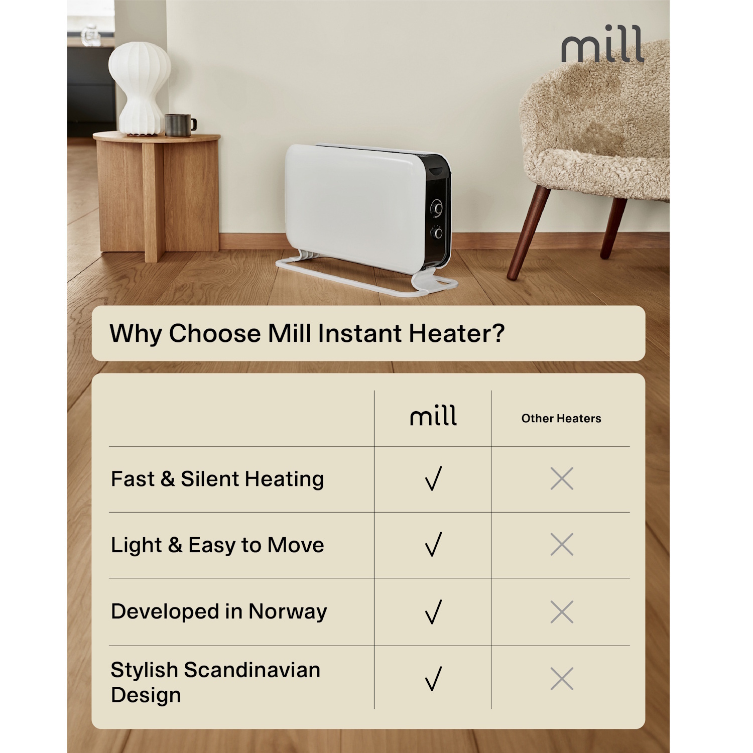 Mill on Norra ettevõte, mis toodab kvaliteetseid, ohutuid ja energiasäästlikke kütteseadmeid kaasaegse skandinaavia disainiga.