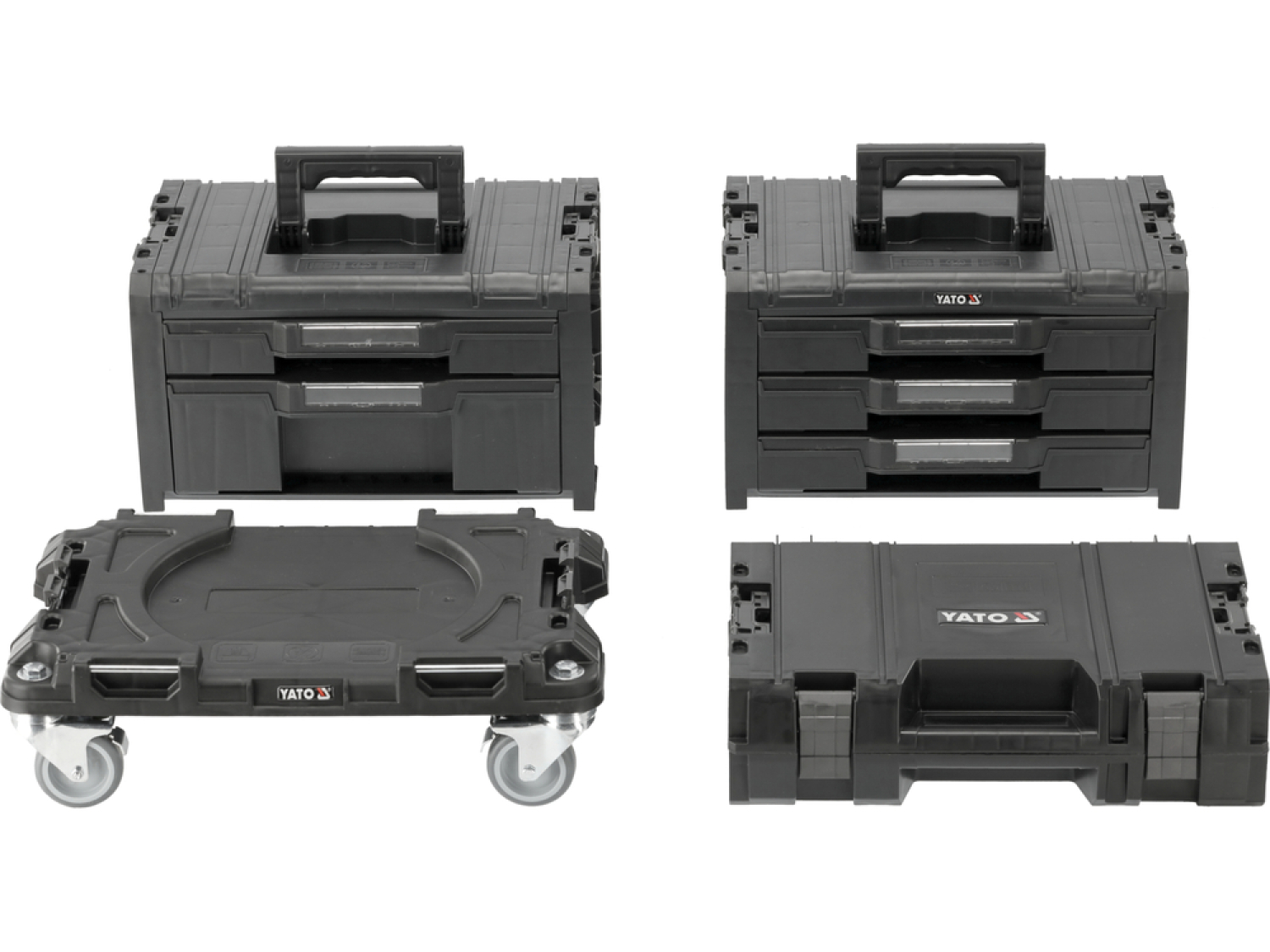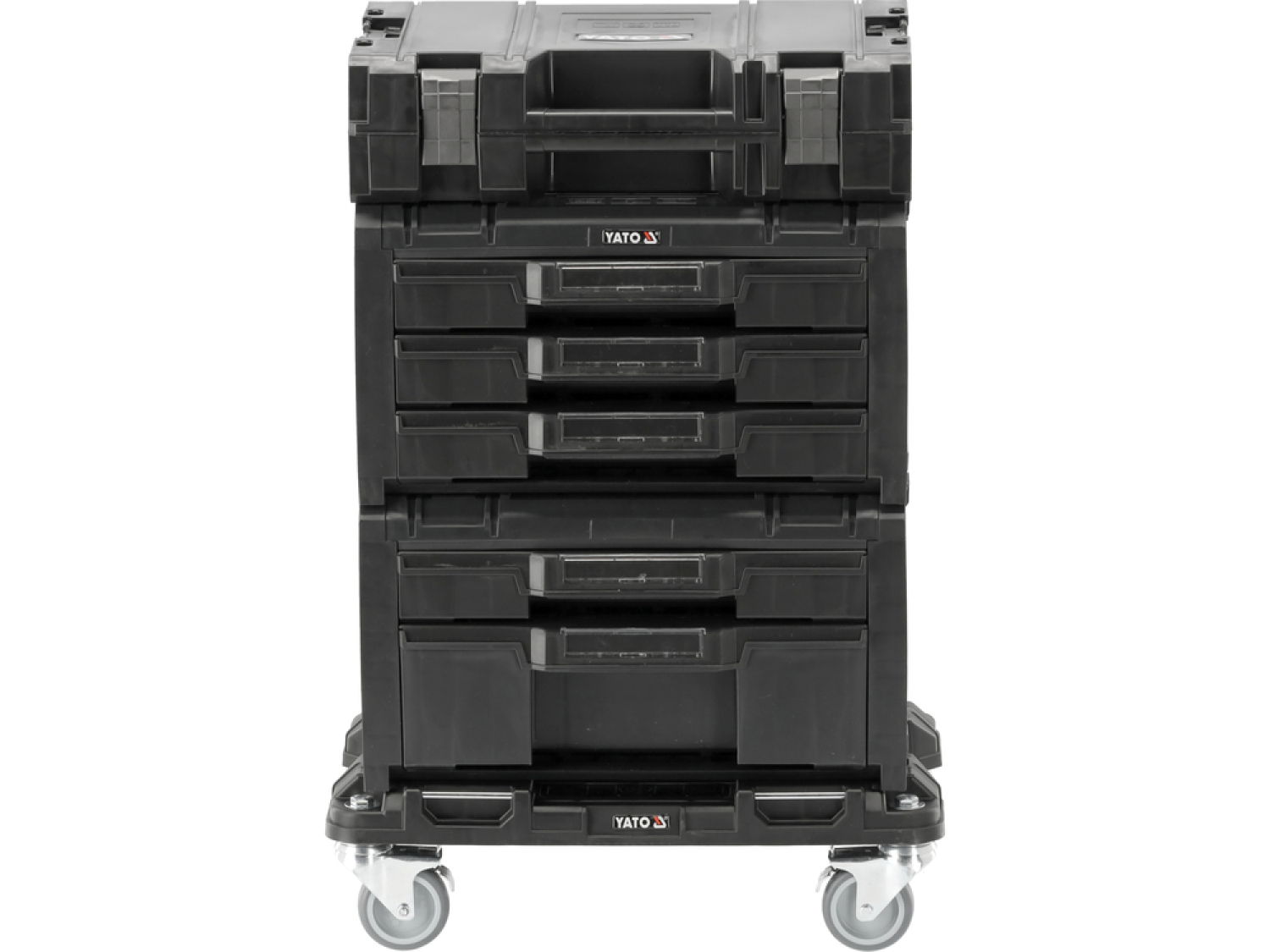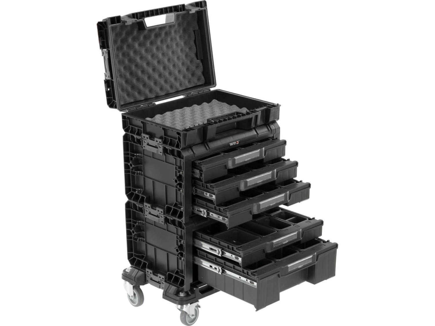 Конструкция позволяет транспортировать ящики с максимальным весом 100 кг, а металлические поворотные колеса обеспечивают отличную маневренность. Комплект ящика с двумя выдвижными ящиками включает перегородки и ведра, что делает его универсальным организатором со всеми преимуществами маленького ящика. Ящик с тремя выдвижными ящиками также укомплектован перегородками и ведрами. В качестве верхнего элемента комплекта предусмотрен компактный контейнер с двумя слоями защитной губки, предназначенный для безопасного хранения электроинструментов, ценных измерительных и диагностических инструментов.