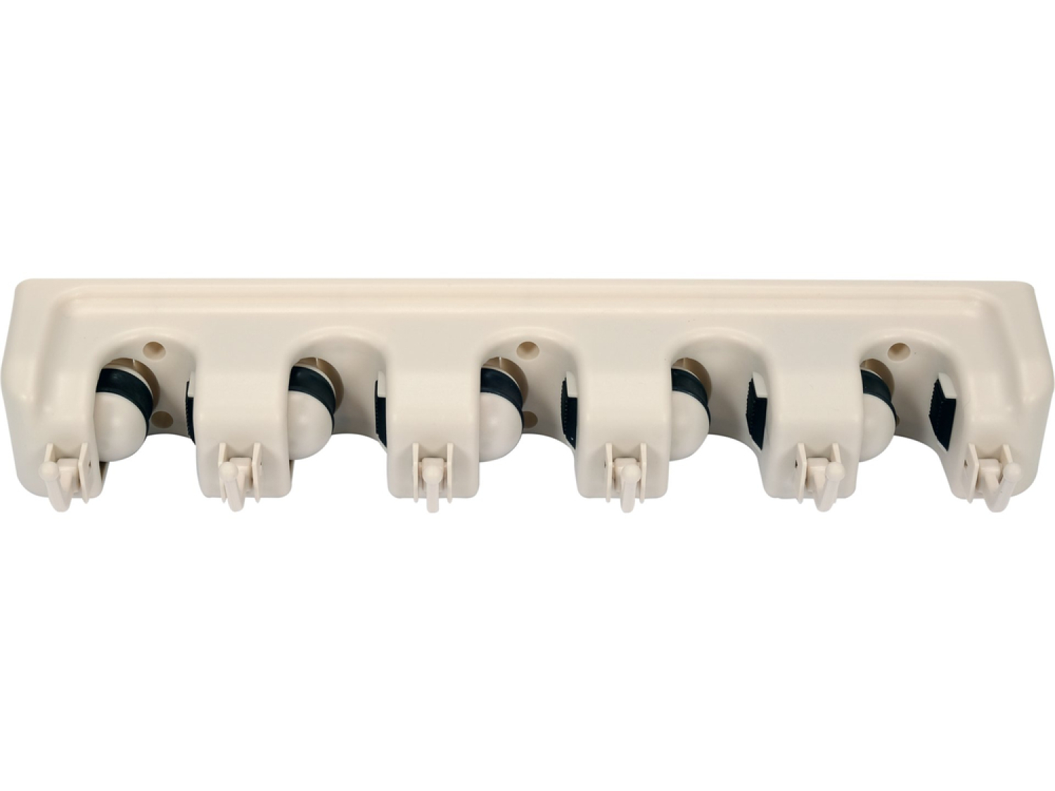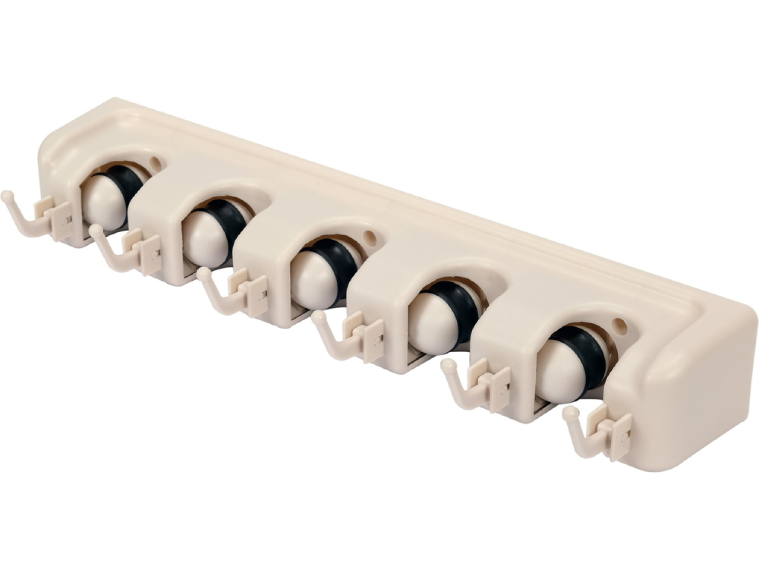 Практичный настенный держатель для садовых и домашних инструментов. Он имеет 5 автоматических захватов, которые адаптируются к толщине ручки, и 6 складных крюков. Передача усилия захватов осуществляется за счет силы тяжести.