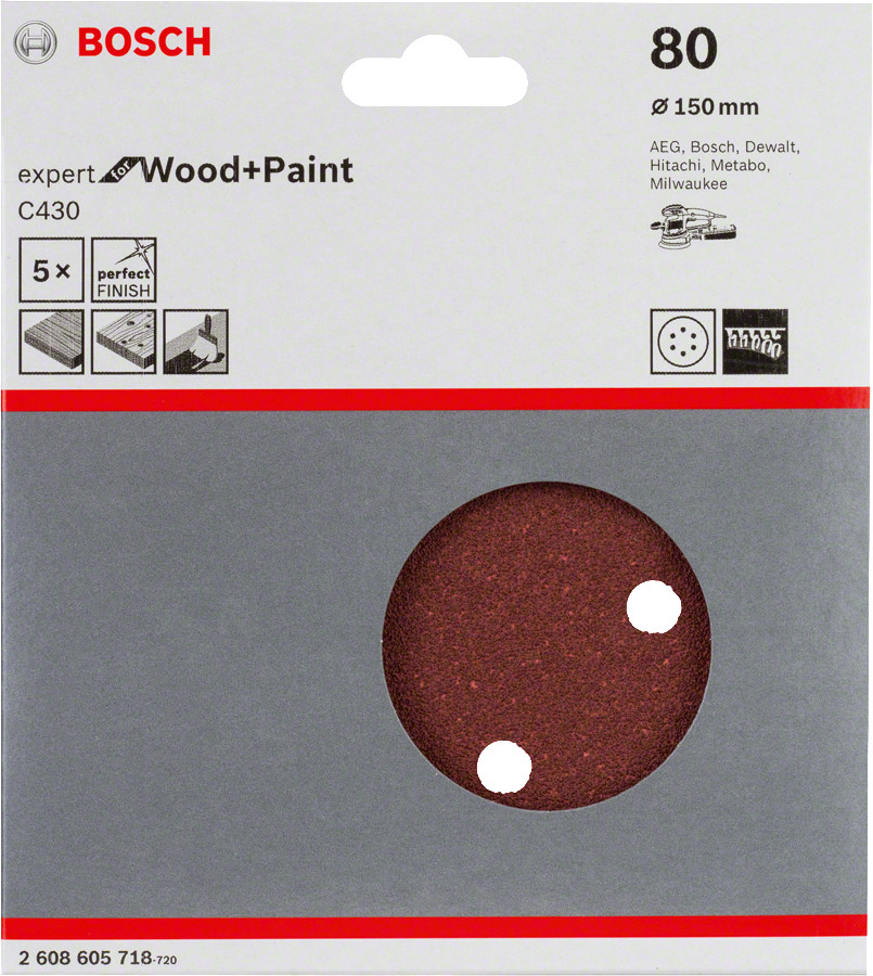 Slīppapīrs,kokam,PEX D=150mm,K80,5 gab., Ekscentra slīpmašīnām, ekscentra slīpmašīnām ar putekļu maisu C430 EXPERT FOR WOOD AND PAINT, 2608605718, BOSCH