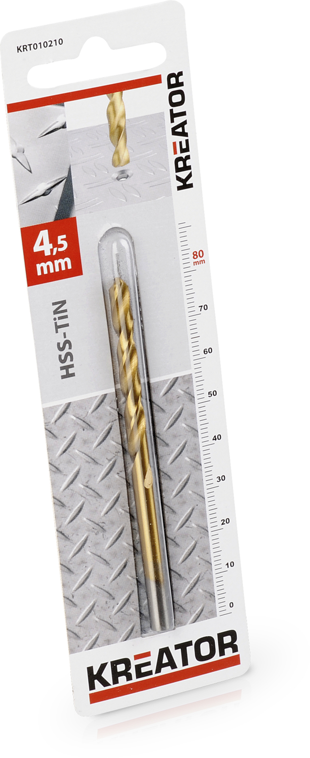Металлическое сверло HSS-TiN от KREATOR идеально подходит для сверления в металле. Оно имеет диаметр 4,5 мм и длину 80 мм. Покрытие из титановым нитридом гарантирует срок службы до 3 раз дольше, чем у традиционного сверла HSS.