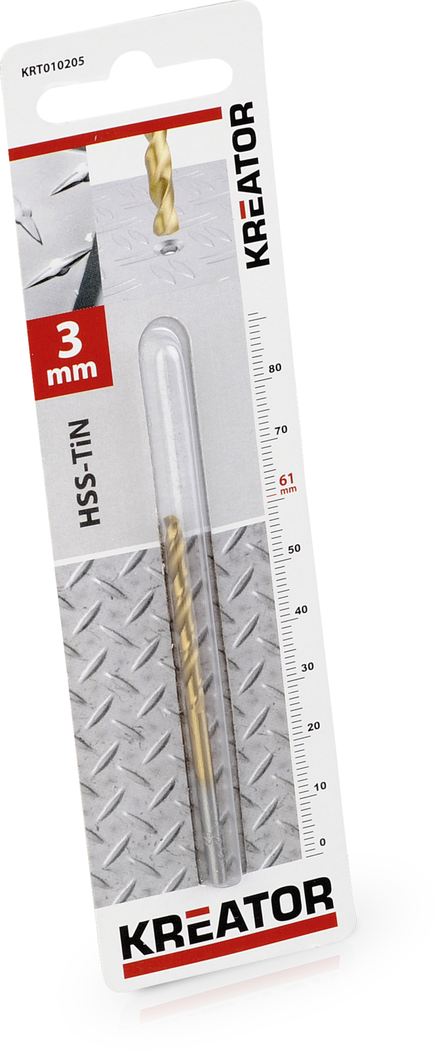 Металлические сверла HSS-TiN Ø 3x61mm от бренда KREATOR идеально подходят для сверления металла. Диаметр сверла составляет 3 мм, а длина - 61 мм. Нитрид титана на поверхности гарантирует срок службы в три раза дольше, чем у традиционных HSS сверл.