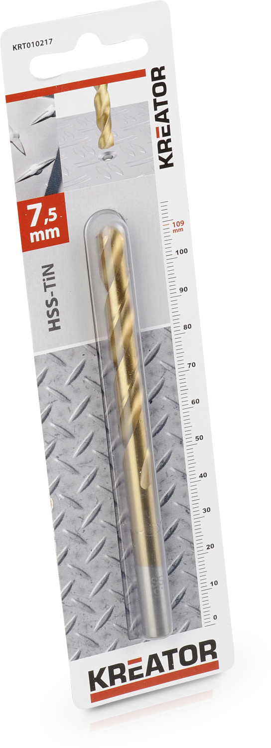 Металлическое сверло HSS-TiN от KREATOR, код KRT010217, идеально подходит для сверления металла. Оно имеет диаметр 7,5 мм и длину 109 мм. Покрытие из титановый нитрида гарантирует срок службы до 3 раз дольше по сравнению с традиционными HSS сверлами.