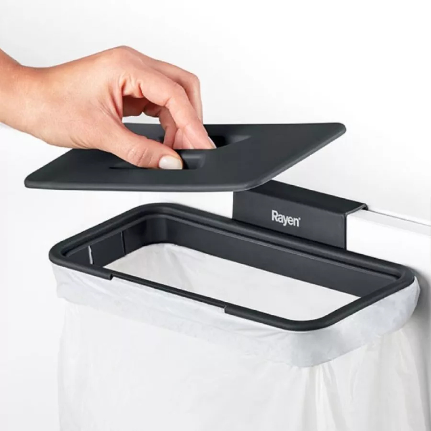 Держатель для мусорных пакетов Rayen с крышкой. Устанавливается без использования винтов. Подходит для использования на всех типах полок и шкафов. Вмещает до 4,5 кг.