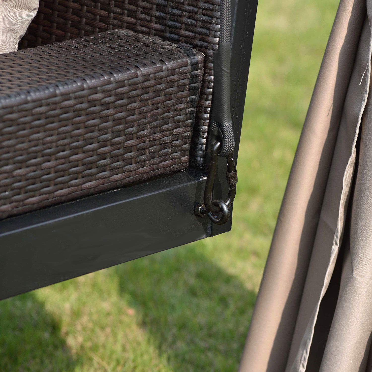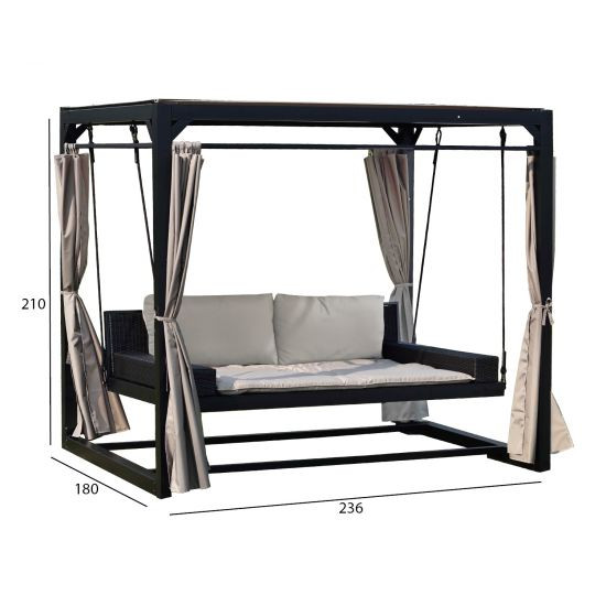 Качели-беседка BARCELONA 200x188xH210см, коричневый/бежевый. Наслаждайтесь летом и отдыхайте, не выходя из дома! Благодаря современному дизайну просторные качели станут прекрасным дополнением к традиционной садовой мебели. Основная конструкция качелей изготовлена из стали и покрыта темно-коричневым порошковым покрытием. Полиэстеровый навес и боковые шторы обеспечивают приятную тень от солнца. Основание сиденья выполнено из текстильного материала, который хорошо пропускает воздух, быстро сохнет и прост в уходе. Спинка сиденья и подлокотники покрыты коричневым пластиковым плетением. В комплект входят 2 мягкие подушки спинки 80x46x18см и подушка сиденья 156x134x4см. Чехлы подушек и подушки сиденья выполнены из полиэфирной ткани. Габариты сиденья качели составляют 195x134xH48 см, ширина подлокотника — 16 см, внутренние размеры сиденья — 156x130 см, высота сиденья от земли — 54 см. Предельный вес — 200 кг. Изделие устойчиво к переменчивым погодным условиям и очень просто в уходе.